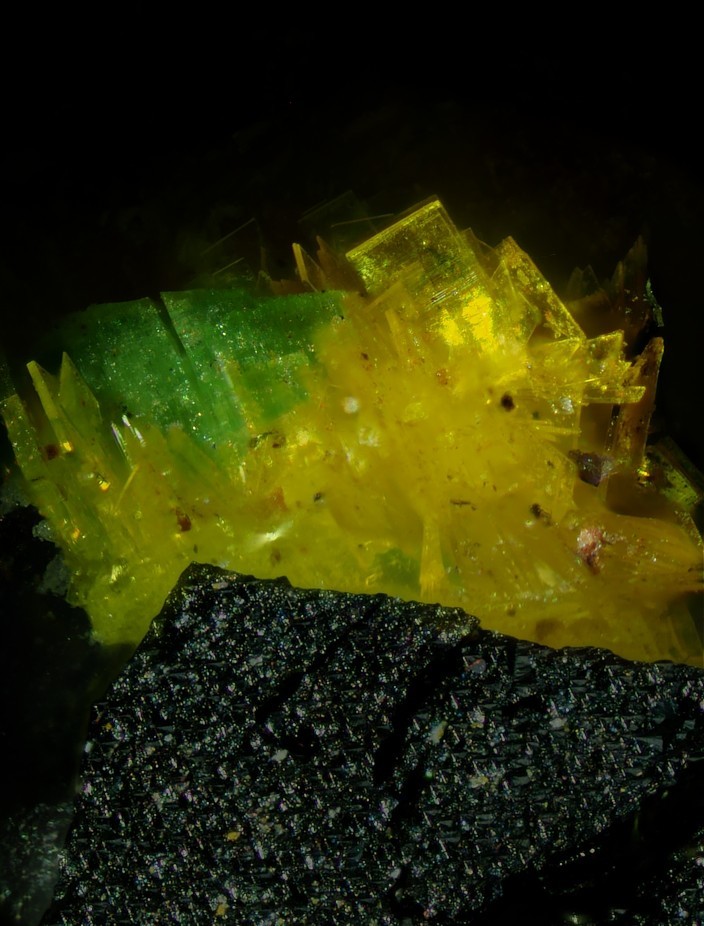 Mineral der Phospuranylit-Gruppe (gelb) zusammen mit Torbernit (grün) auf dunkelviolettem Stinkspat aus der Uranlagerstätte Krunkelbachtal, Menzenschwand, Schwarzwald. Bildhöhe etwa 2 mm. Ex.Coll. Döblin, Riehen, CH.