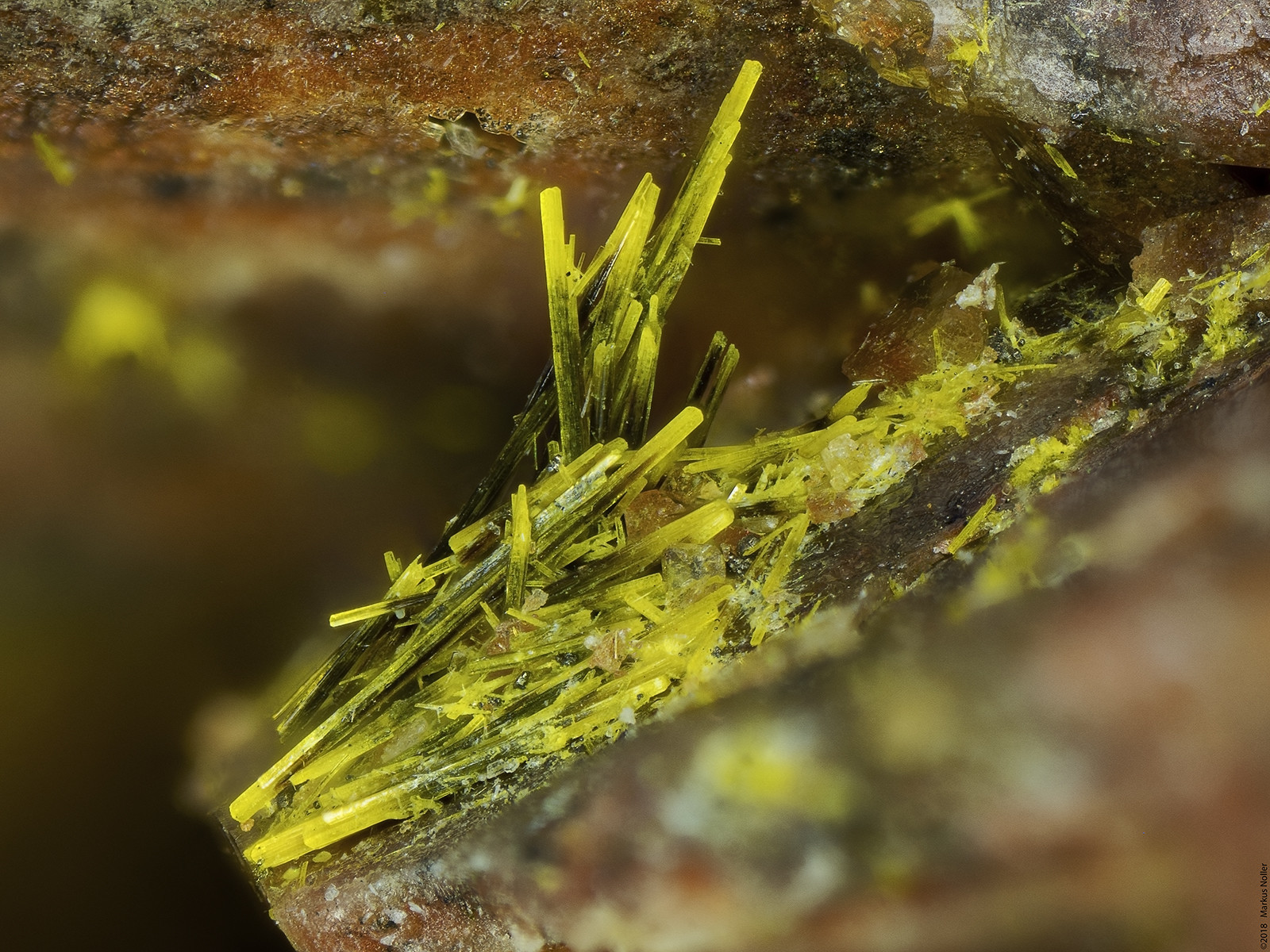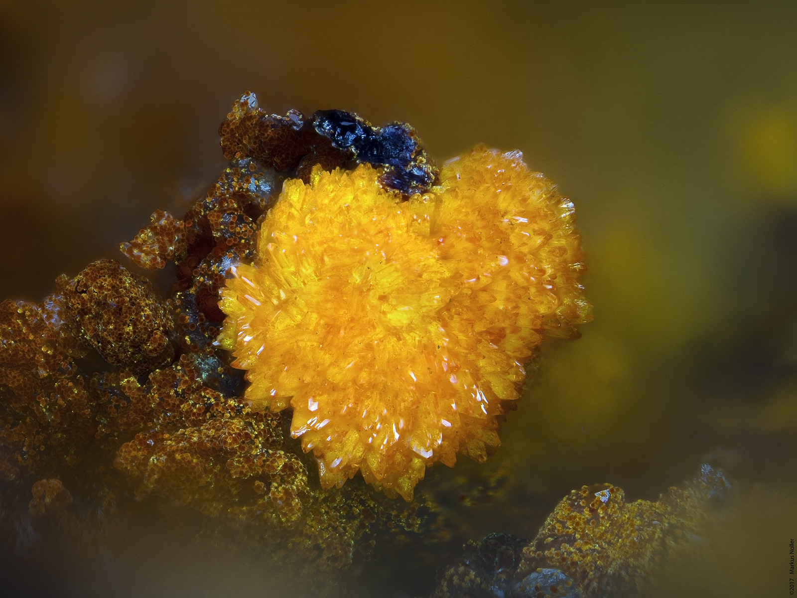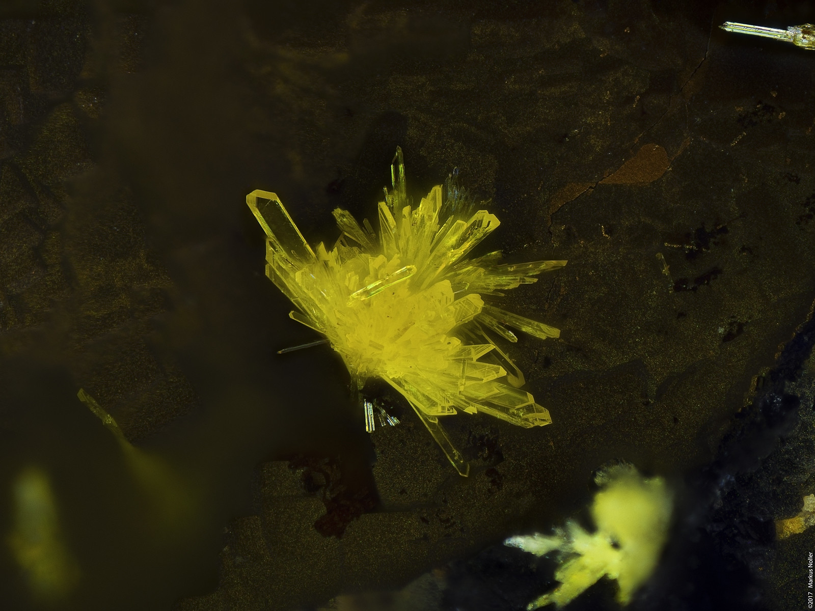 Dann habe ich gestern noch eine sehr interessante Entdeckung gemacht, als ich meine Cuprosklodowskitstufen aus Musonoi/Kongo mal wieder unter dem Mikroskop betrachtet habe. Das habe ich gefühlt schon hundert mal getan, aber irgend wie ist mir das immer entgangen. Auf einer Stufe sitzt gediegen Gold auf Cuprosklodowskit xx. Ich habe schon von Vergesellschaftung von Gold mit Pechblende, Torbernit und Vandenbrandeit gelesen/gesehen/gehört, aber auf Cuprosklodowskit xx ist mir bis dato nicht bekannt. Das hat mich dann doch etwas (freudig) überrascht...