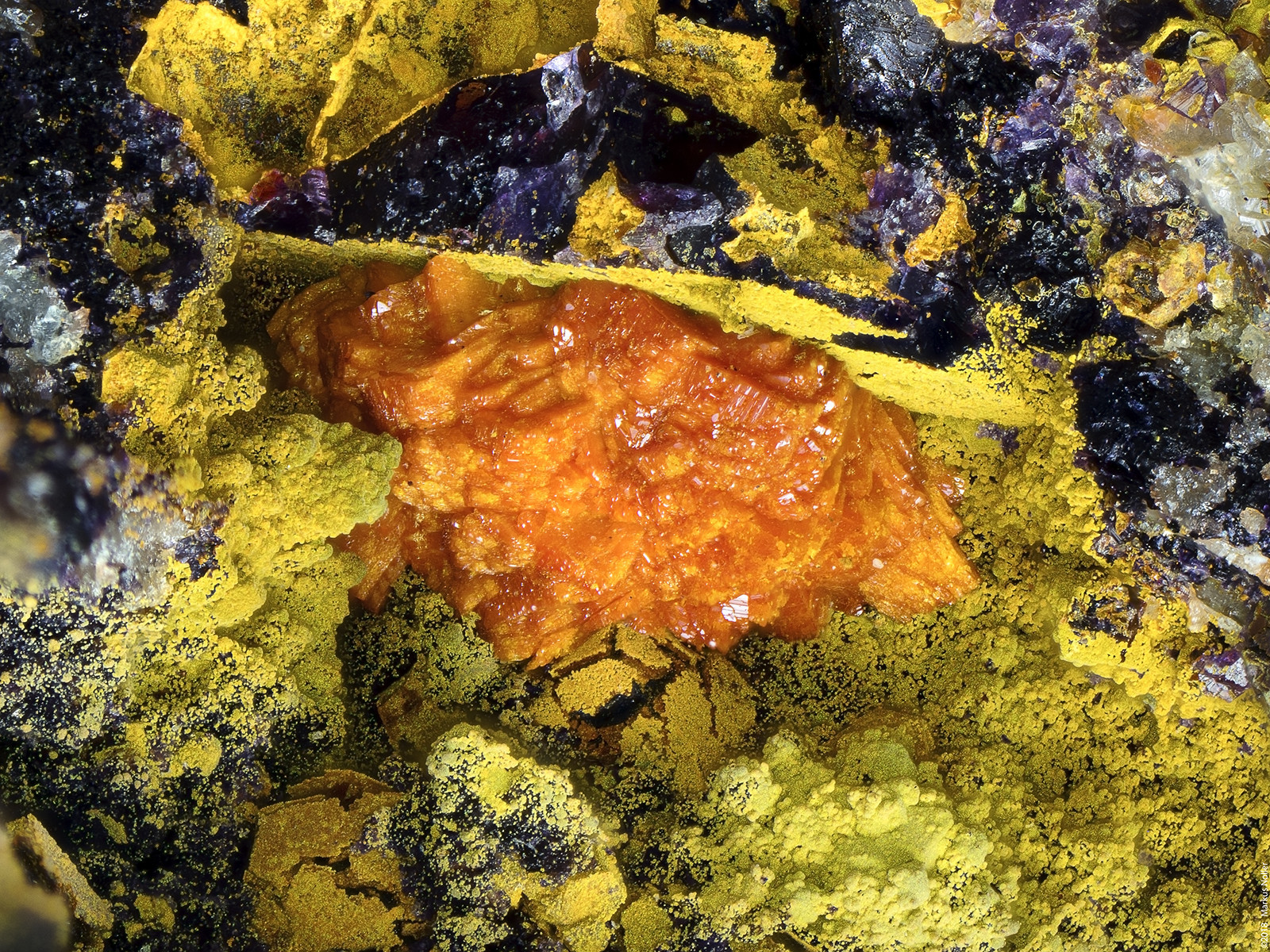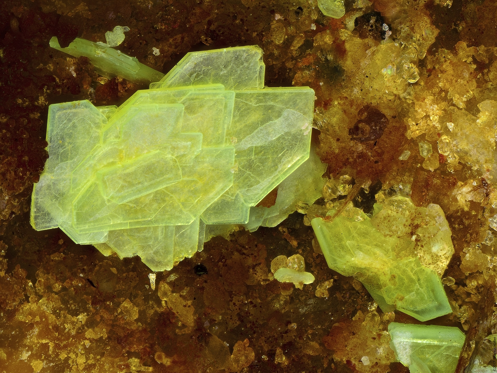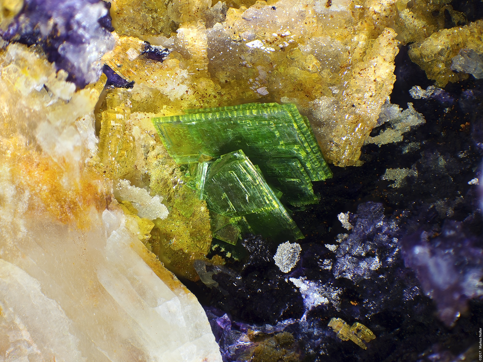 Dann habe ich gestern noch eine sehr interessante Entdeckung gemacht, als ich meine Cuprosklodowskitstufen aus Musonoi/Kongo mal wieder unter dem Mikroskop betrachtet habe. Das habe ich gefühlt schon hundert mal getan, aber irgend wie ist mir das immer entgangen. Auf einer Stufe sitzt gediegen Gold auf Cuprosklodowskit xx. Ich habe schon von Vergesellschaftung von Gold mit Pechblende, Torbernit und Vandenbrandeit gelesen/gesehen/gehört, aber auf Cuprosklodowskit xx ist mir bis dato nicht bekannt. Das hat mich dann doch etwas (freudig) überrascht...