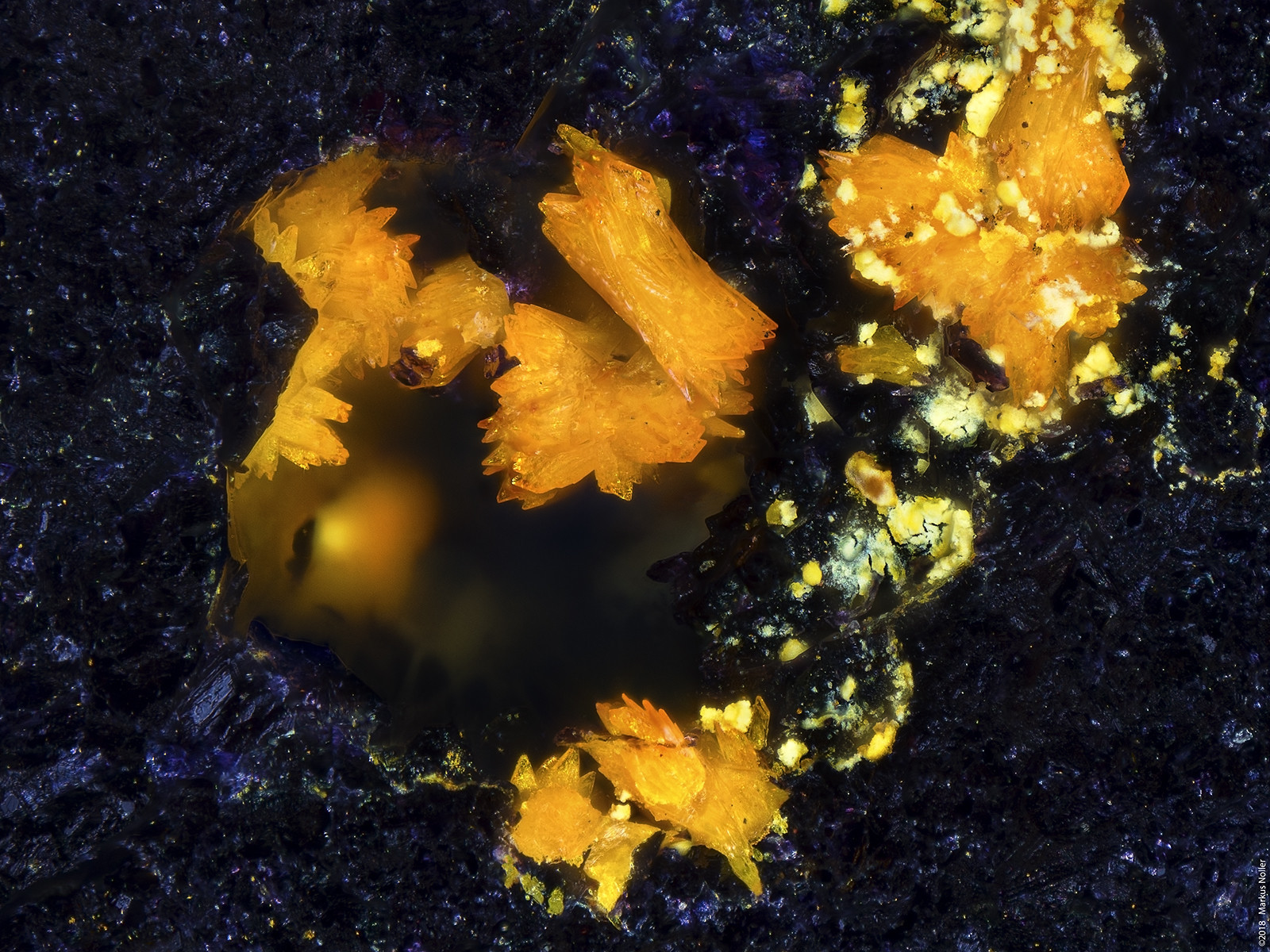 Dann habe ich gestern noch eine sehr interessante Entdeckung gemacht, als ich meine Cuprosklodowskitstufen aus Musonoi/Kongo mal wieder unter dem Mikroskop betrachtet habe. Das habe ich gefühlt schon hundert mal getan, aber irgend wie ist mir das immer entgangen. Auf einer Stufe sitzt gediegen Gold auf Cuprosklodowskit xx. Ich habe schon von Vergesellschaftung von Gold mit Pechblende, Torbernit und Vandenbrandeit gelesen/gesehen/gehört, aber auf Cuprosklodowskit xx ist mir bis dato nicht bekannt. Das hat mich dann doch etwas (freudig) überrascht...