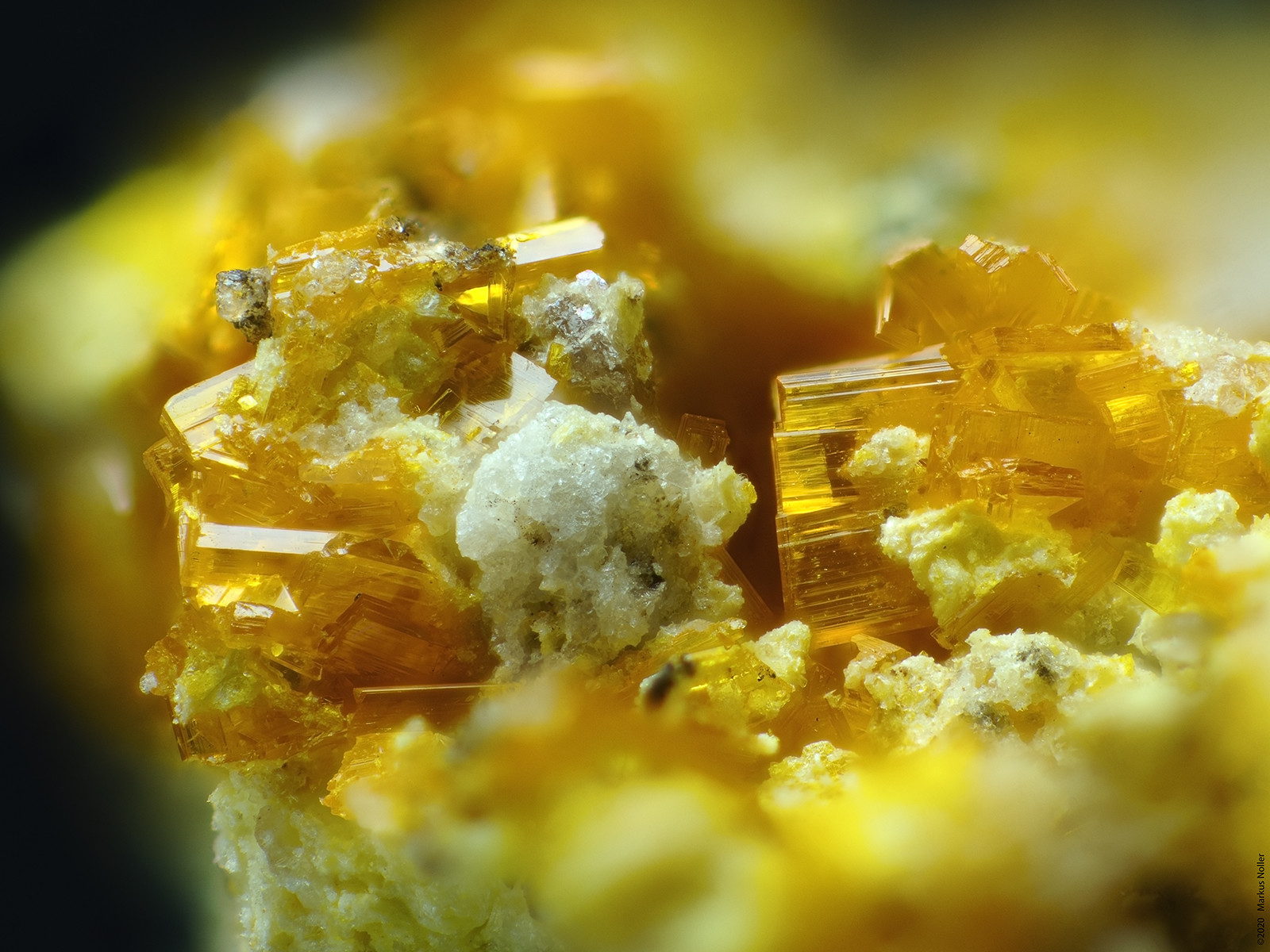 Gelbe Seelit xx begleitet von weiß-transparentem Uranospinit xx auf Uraninit