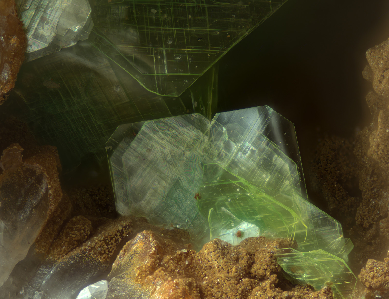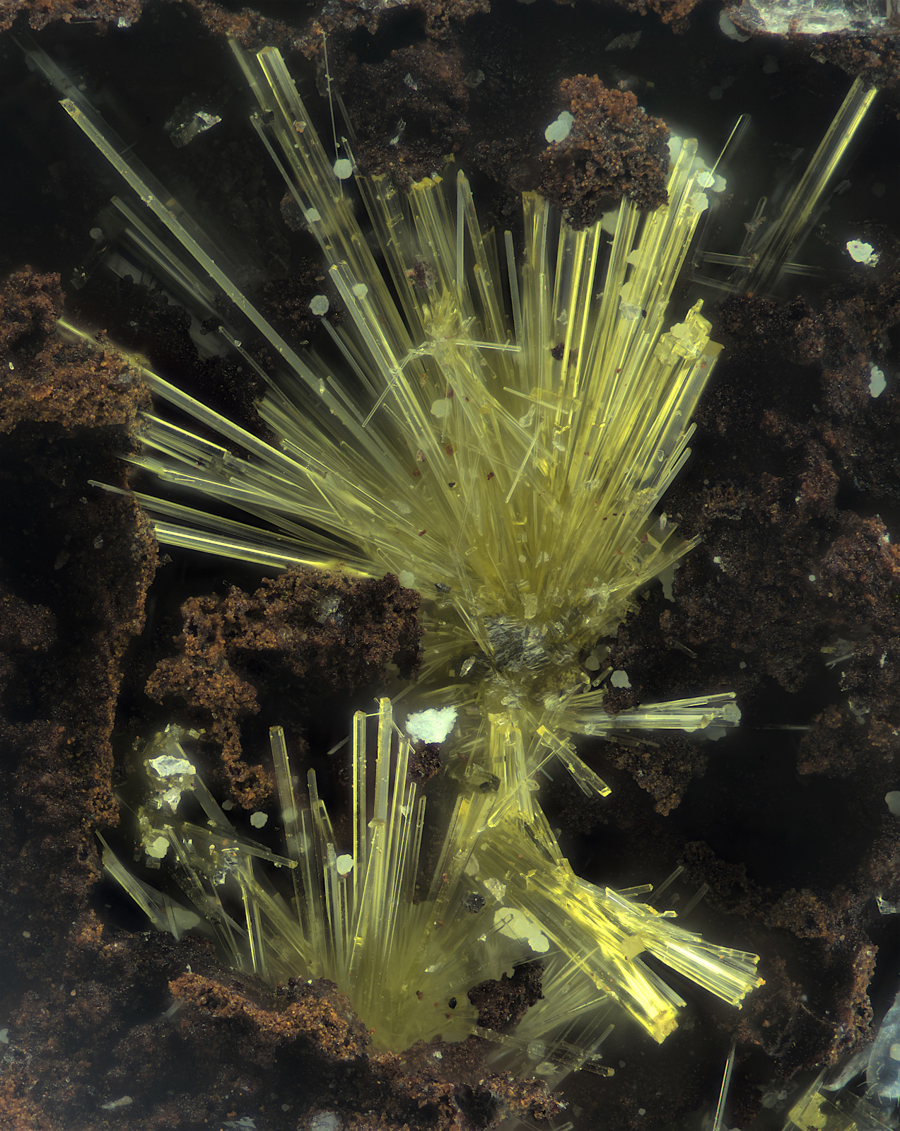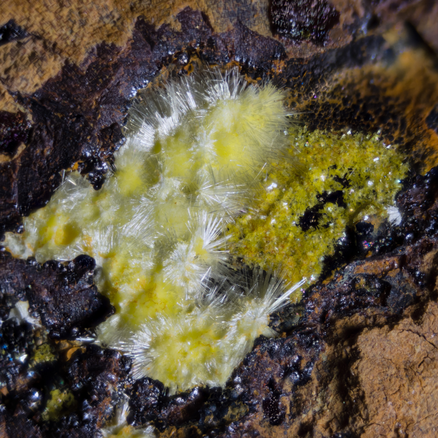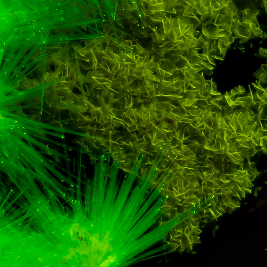 Uranophan mit Phosphuranylit von Sardinien. Unter UV-Beleuchtung sieht man deutlich die unterschiedliche Farbe der Lumineszenz.