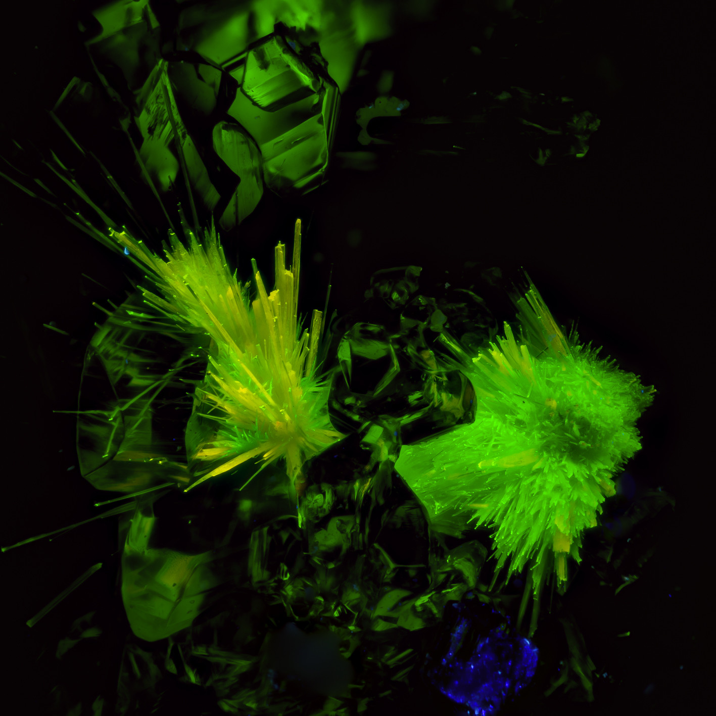 Das sind zwei verschiedene Kristalle - die einen leuchten grün, die anderen gelb... Tatsächlich handelt es sich bei den grün leuchtenden Kristallen um Boltwoodit und bei den gelben um eine Epitaxie aus Sklodowskit und Boltwoodit.