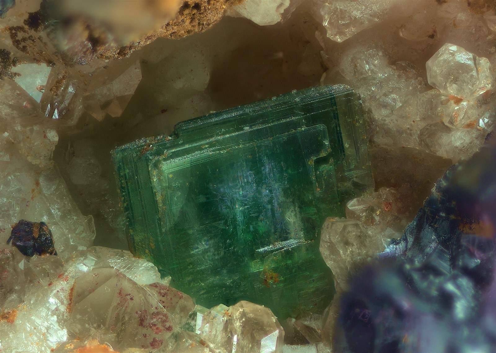 genauerer Fundort ist im Schacht 384 (Paitzdorf), 300m Sohle, Strecke 1010-93, in der Firste am Eingang zur Werkstatt hatten einsickernde uranhaltige Wässer mit dem anstehenden Beton interagiert, was u.a. zur Bildung von Johannit führte. Fund 8/1989, ex.Slg.Fritz Rüger, Bildbreite ist 3,8 mm.