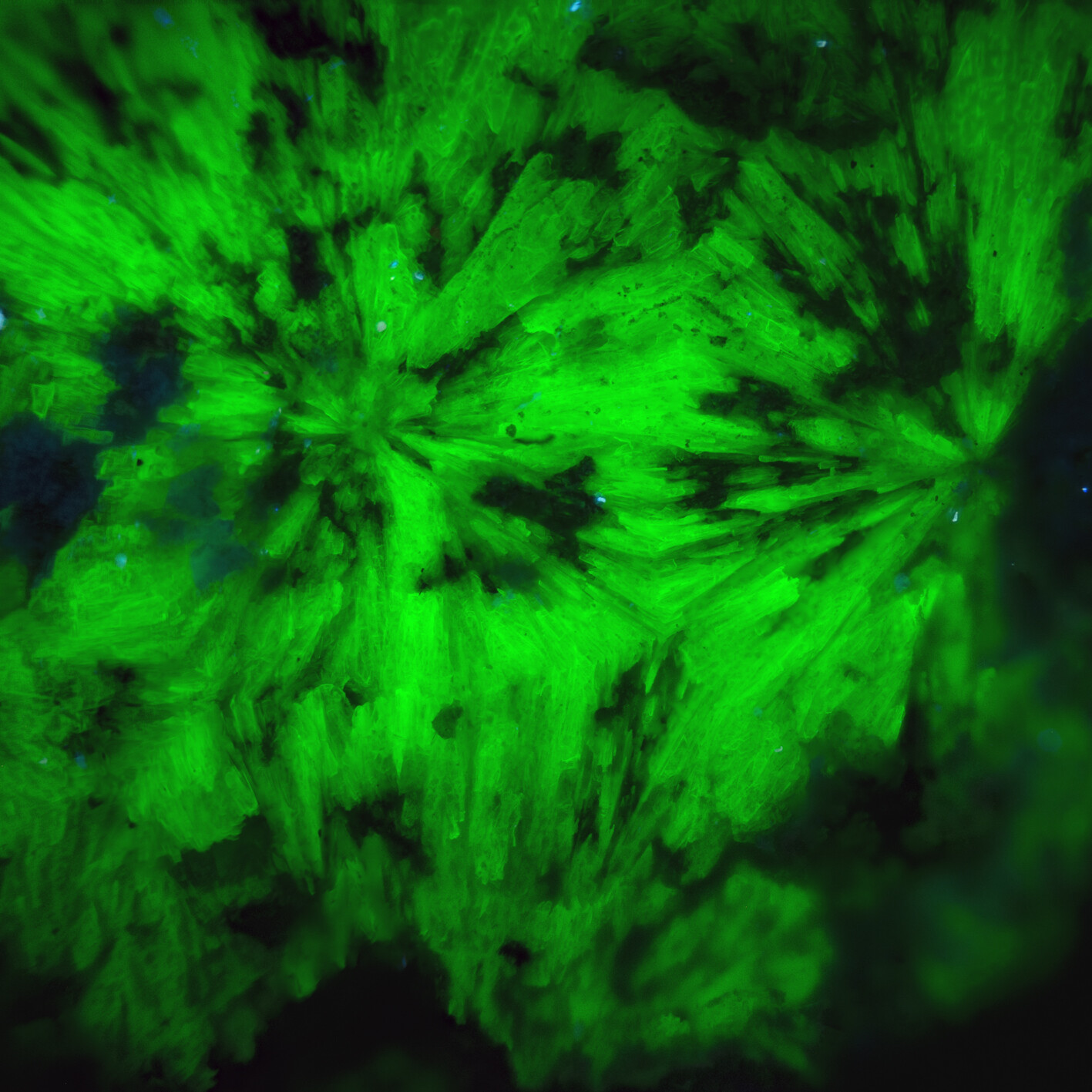 Von ganz wo anders: Boltwoodit von der New Method Mine in Kalifornien, beide Male mit intensiver, gelber Lumineszenz mit interessantem Kontrast zur Matrix: