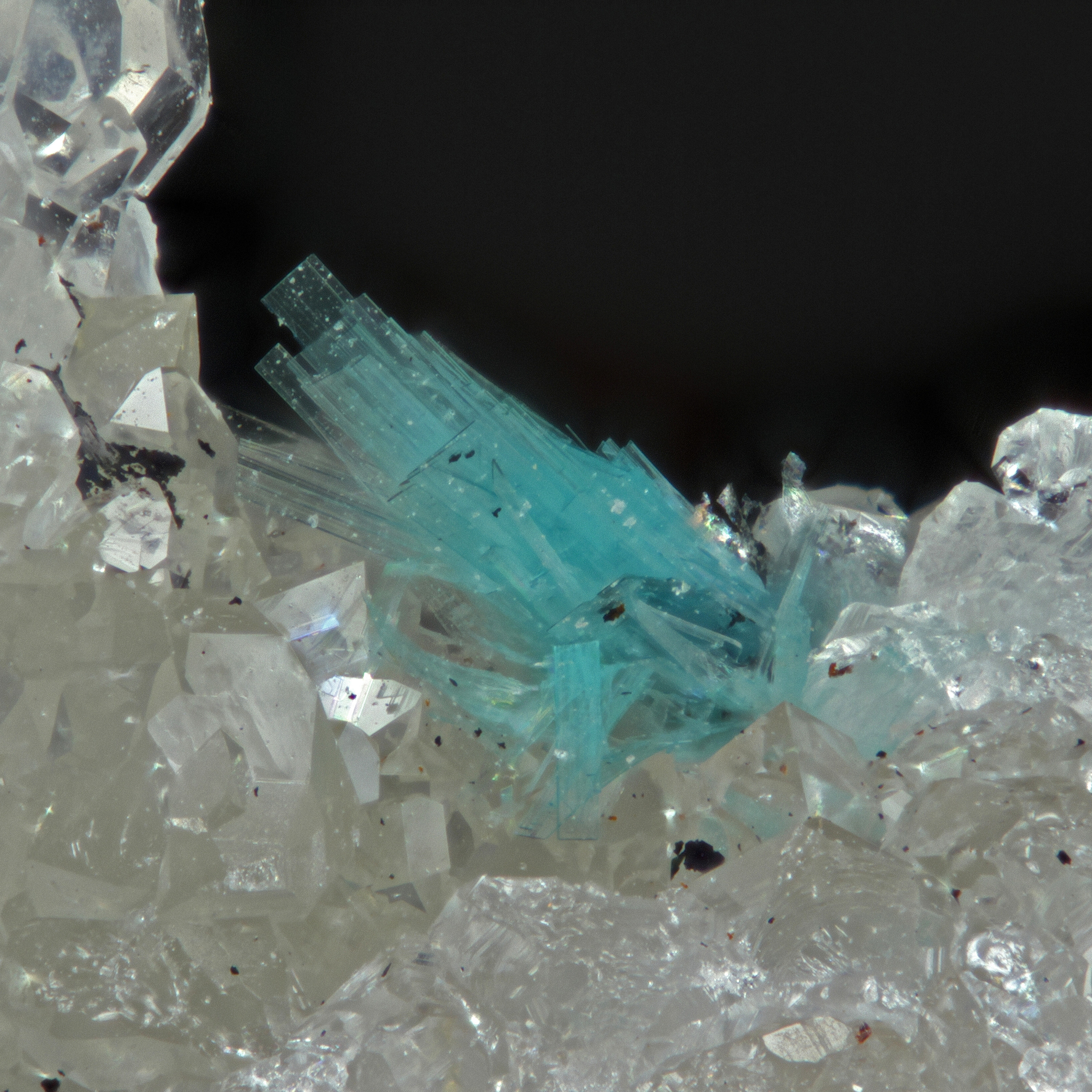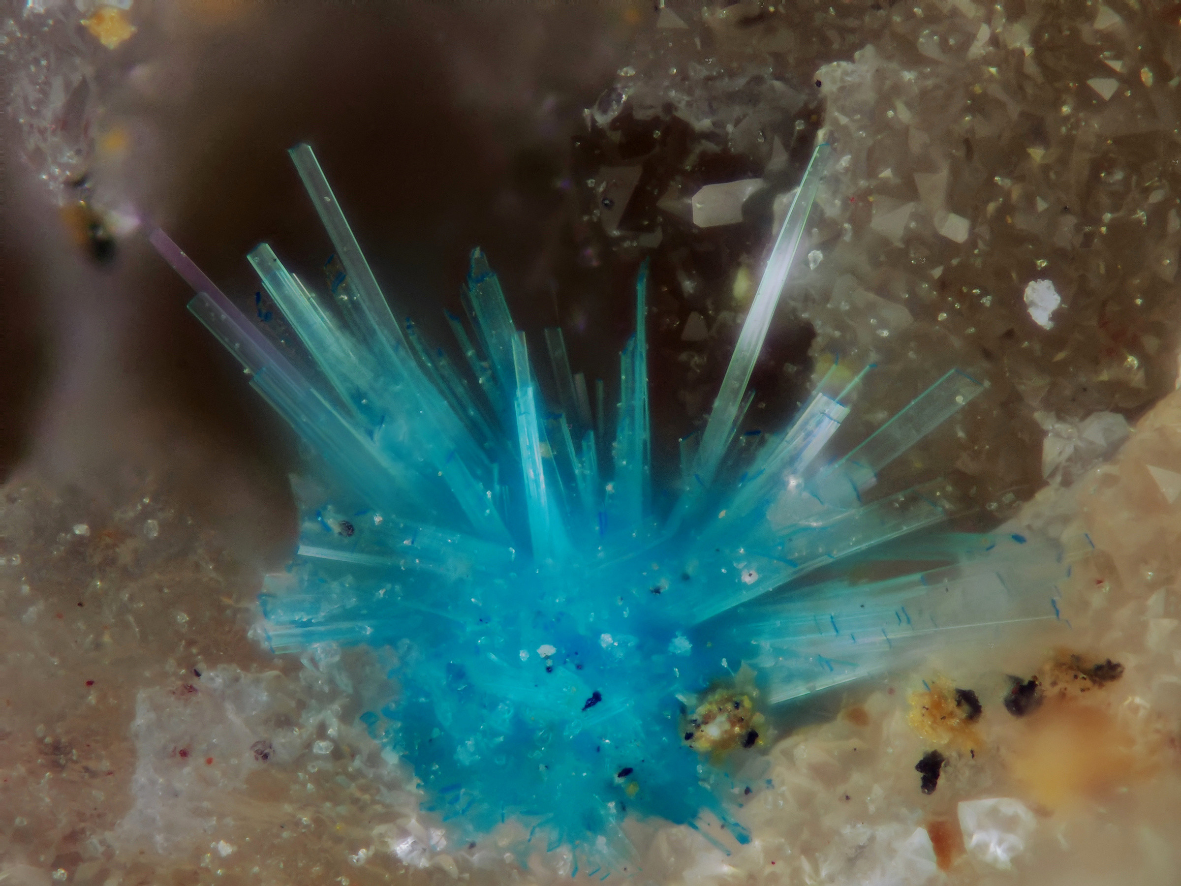 ich halte es aufgrund des nadeligen Habitus für ein Mineral der Devillin-Gruppe. Da Zink an der Fundstelle selten vorkommt, ist es eher Devillin als Serpierit. Laut Auskunft von Christian Rewitzer gibt es an der Fundstelle Devillin. Ein anderes Stück mit ebenfalls nadelig plattigen Kristallen hat sich bei der EDX, die er mir dankenswerter weise machte, als Lavendulan herausgestellt.