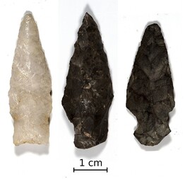 aber einmal bestehen die Spitzen rechts aus Flint, einmal aus Obsidian.