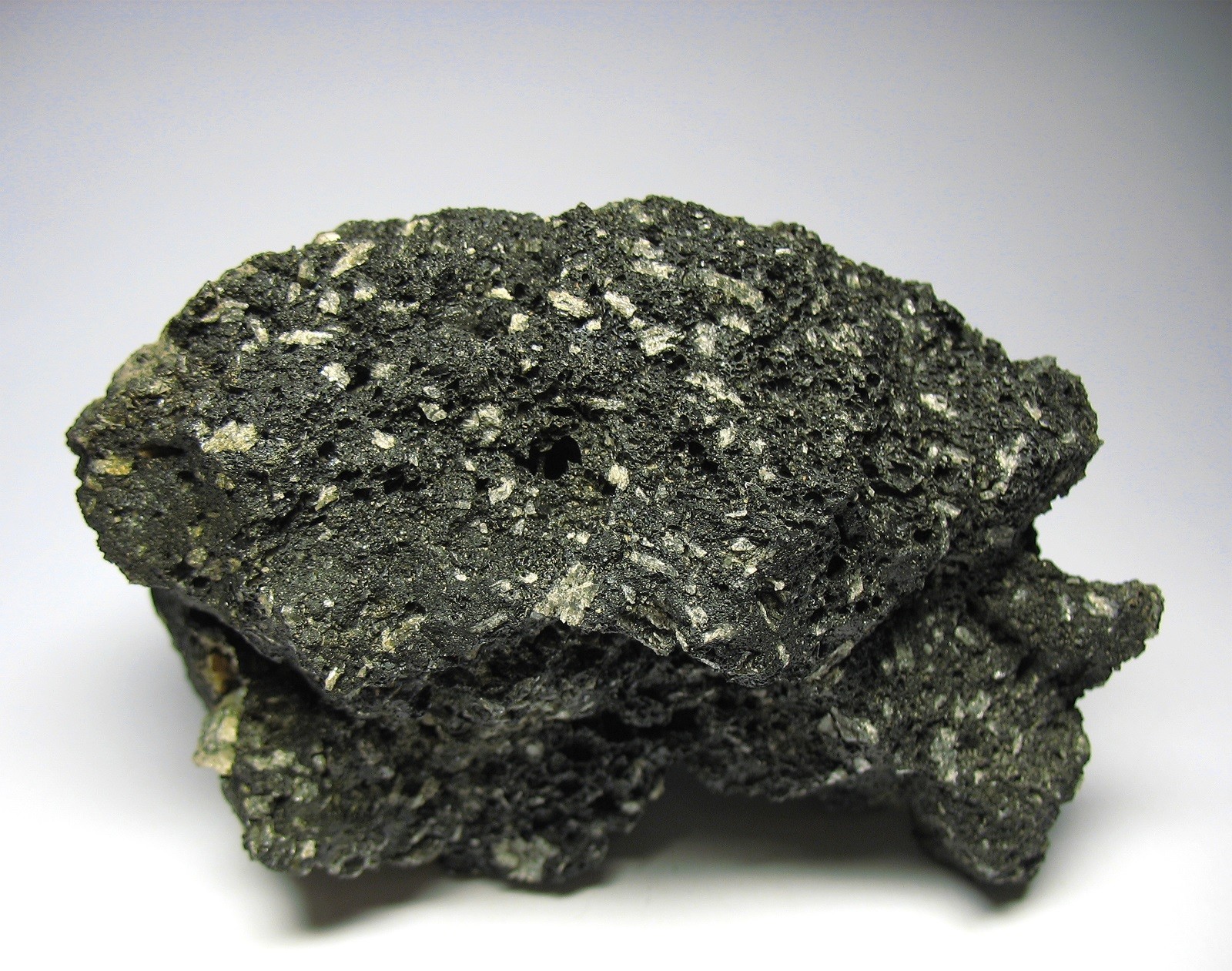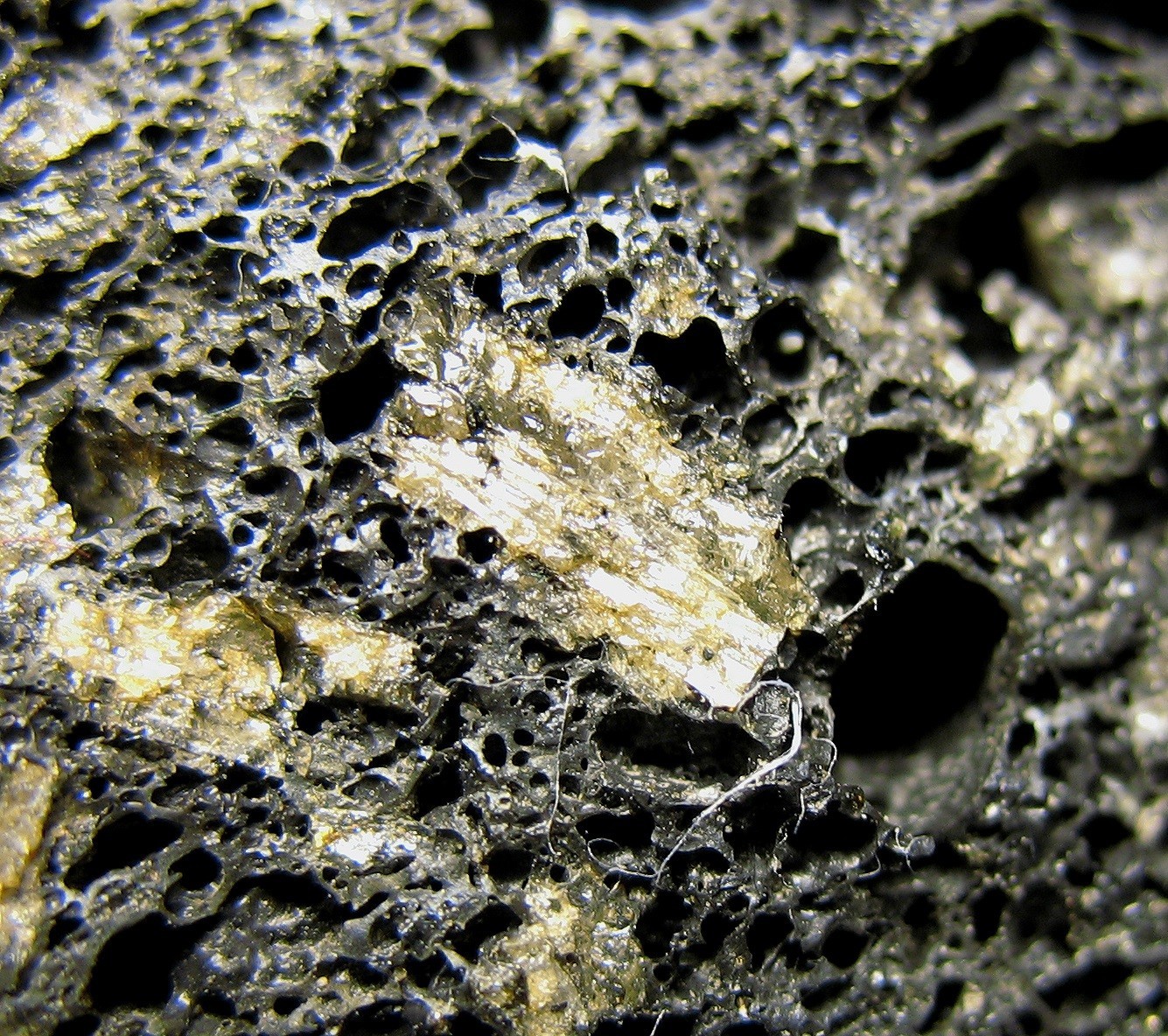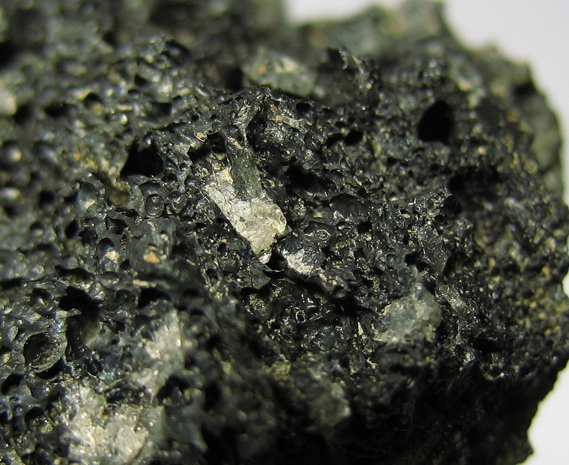 Das Gestein ist hier blasenreich und leicht und beinhaltet weißgelbliche Kristalle. Spontan tippe ich auf Andesin.