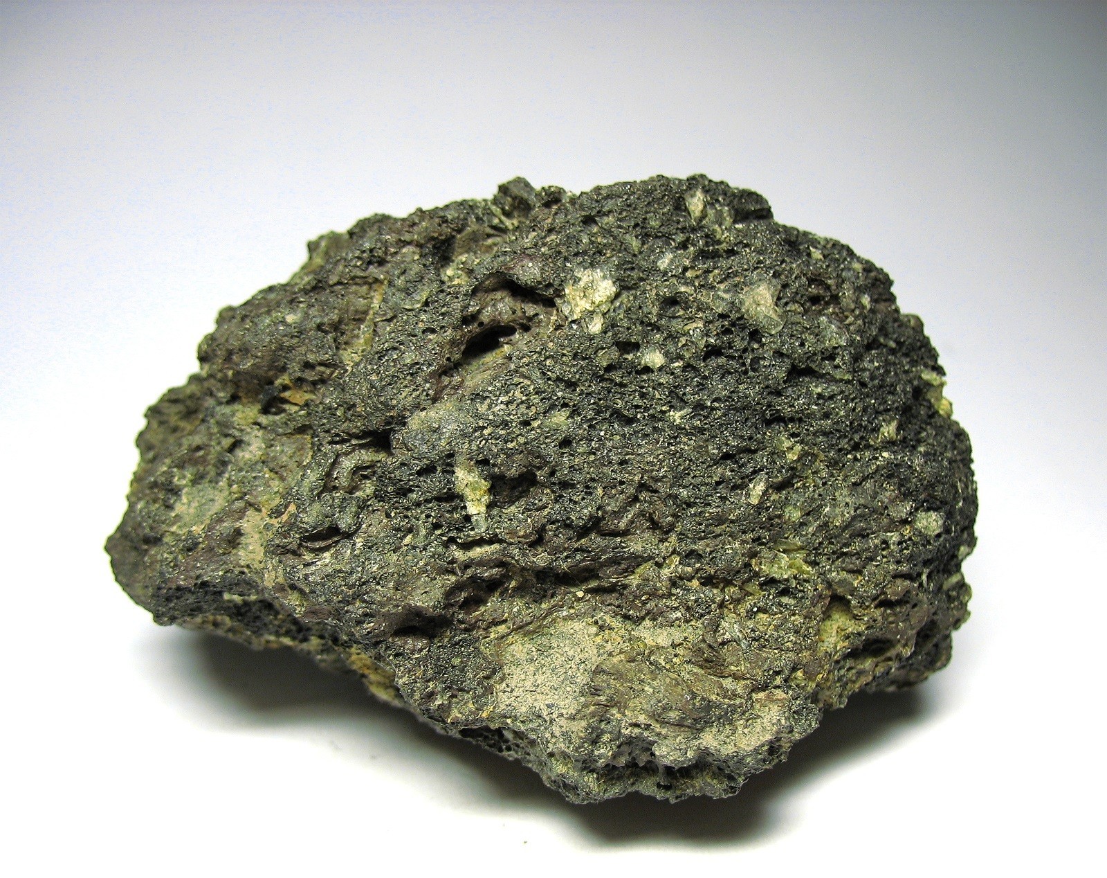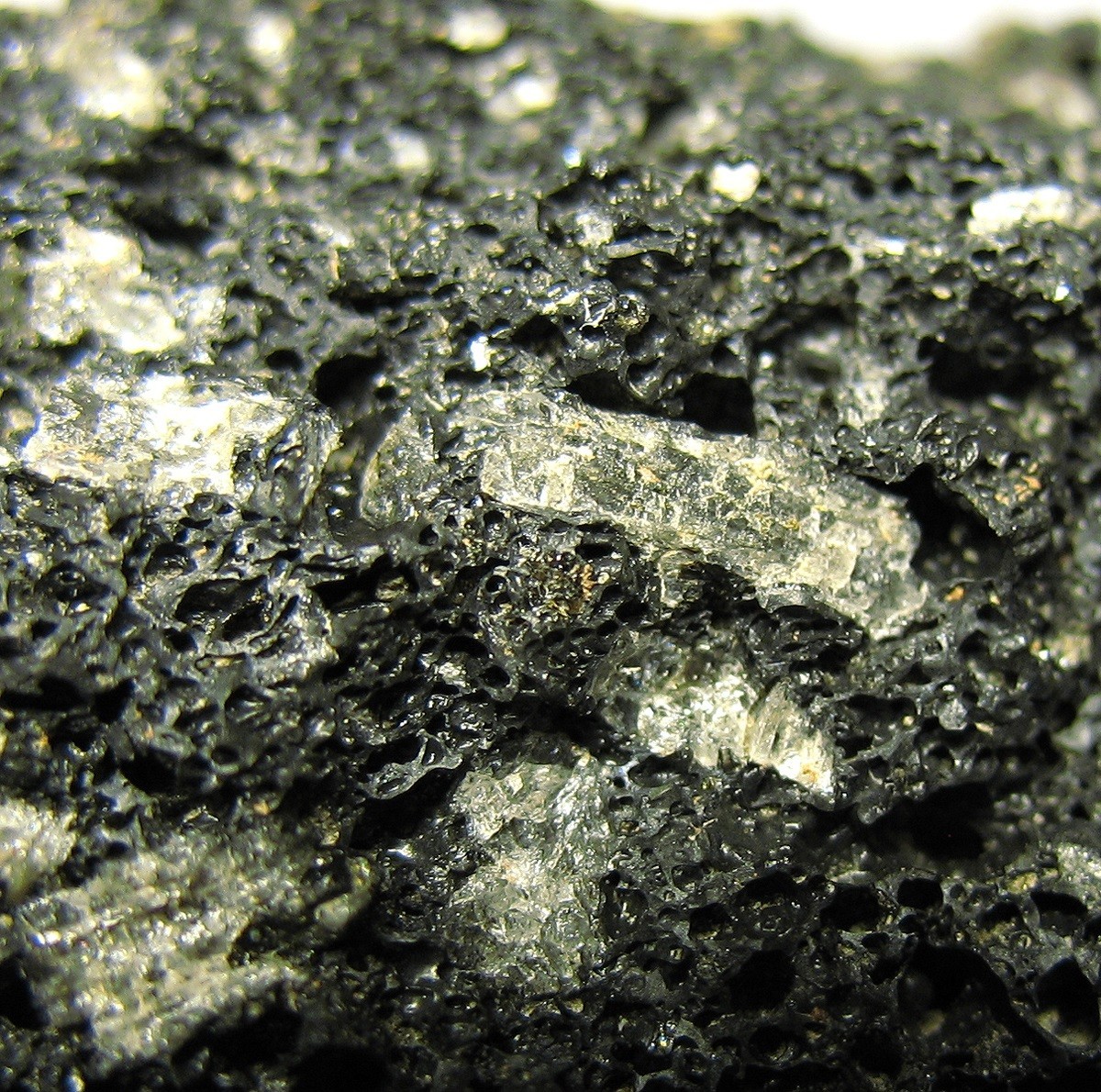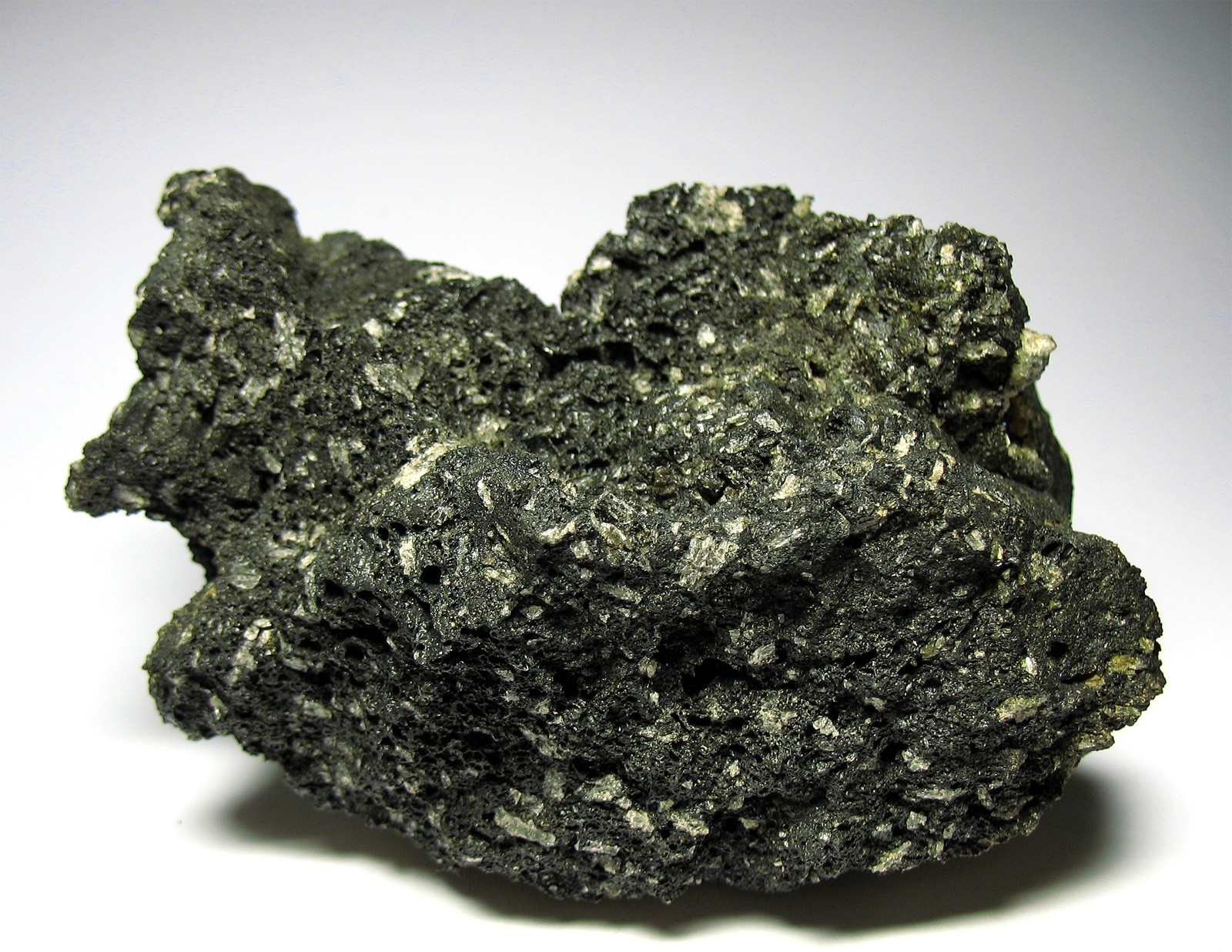 Das Gestein ist hier blasenreich und leicht und beinhaltet weißgelbliche Kristalle. Spontan tippe ich auf Andesin.