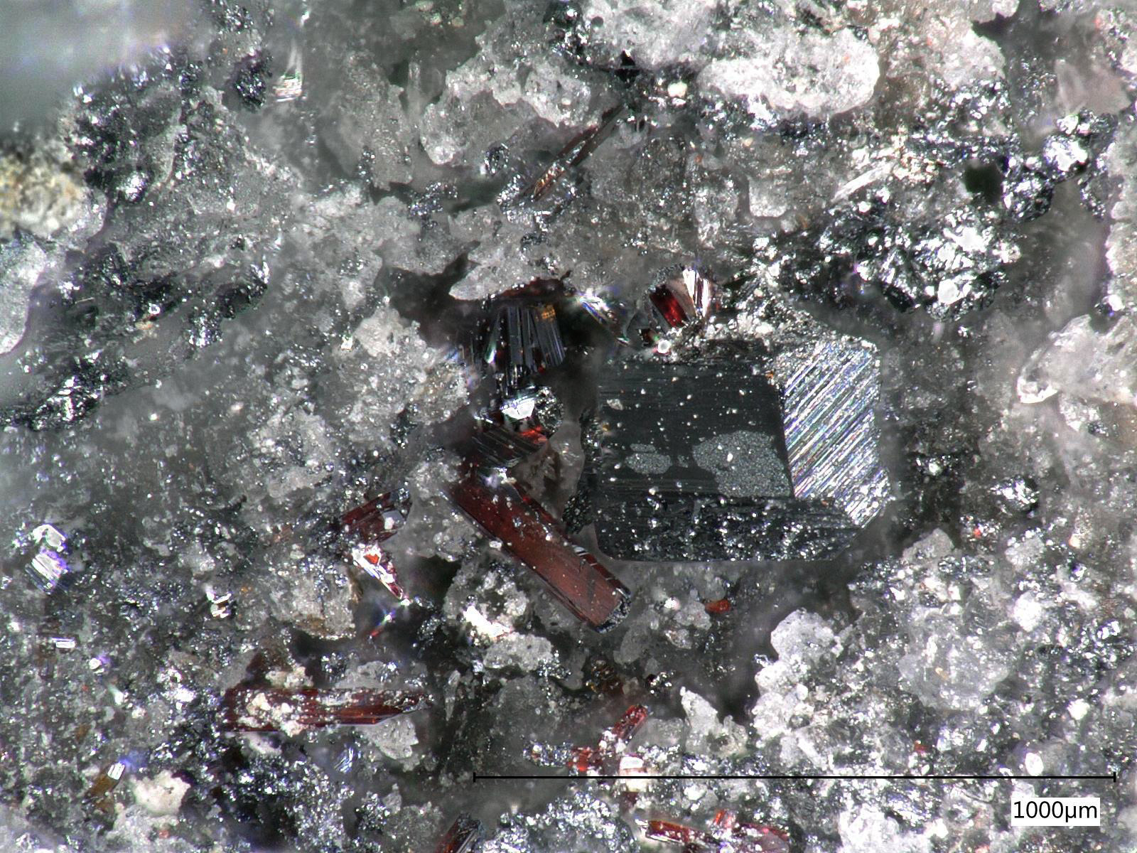 Vor ein paar Jahren haben die Marokkaner auf den Börsen München und Hamburg noch haufenweise Proustitstufen "verramscht" und dort hatte ich ein paar mal zugeschlagen. Natürlich habe ich mir die z.T. recht großen Stücke unter dem Bino aufmerksam angeschaut und auch etliche schwarze, sechsseitiger Täfelchen gefunden, die oft innig verwachsen sind und Deinen sehr ähnlich sind. Nach einer EDX-Analyse bin ich auf Pearceit/Polybasit-Verwachsungen gekommen. Akanthit halte ich für Unwahrscheinlich, da dieser von der Imiter (jedenfalls nach meiner Kenntnis) typische Pseudomorphosen nach Argentit darstellen und somit auch die matten, irgendwo vom Würfel abgeleiteten Formen bilden, meistens extrem verzerrt. Akanthit kannst Du übrigens sehr leicht daran erkennen, das er sehr weich ist, d.h., mit einer Nadel lässt er sich sehr leicht "ritzen" bzw. verformen, während Pearceit und Polybasit spröde sind.