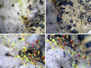 Die fragliche Substanz (schuppig, blättrig, pigmentiert mit keiner Kristallstruktur und großen Farbenspiel) sieht für den Betrachter der Aufnahmen sehr unnatürlich