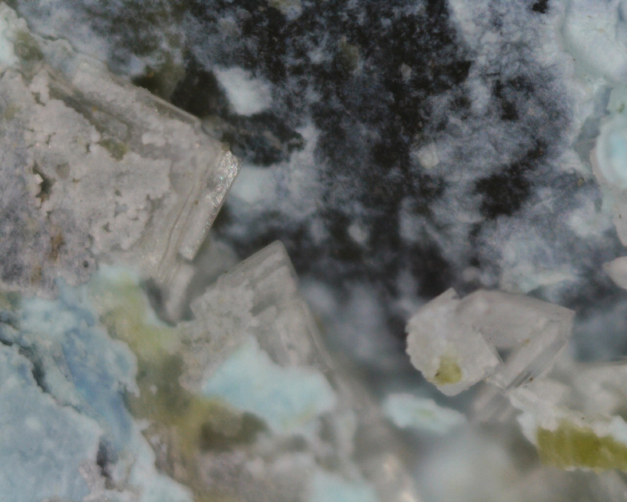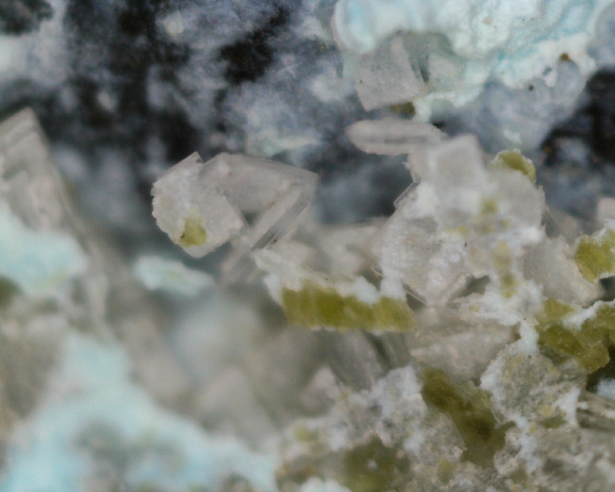 1. Farblose viereckige Täfelchen mit blaßbräunlichen Überzug auf einer Serpentinmatrix mit Mcguinnessit.