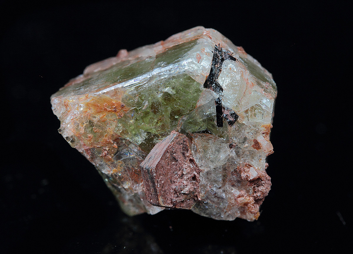 Eine Stufe 16cm x 12cm x 8cm, mit einem 4cm x 2.5cm großen Gadolinitkristall zusammen mit Orthit/Allanitkristallen bis 9cm Länge.