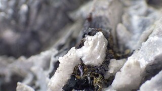 Ich sehe da hauptsächlich Calcit xx und unten sind mit viel Fantasie schwarze tafelige xx erkennbar.