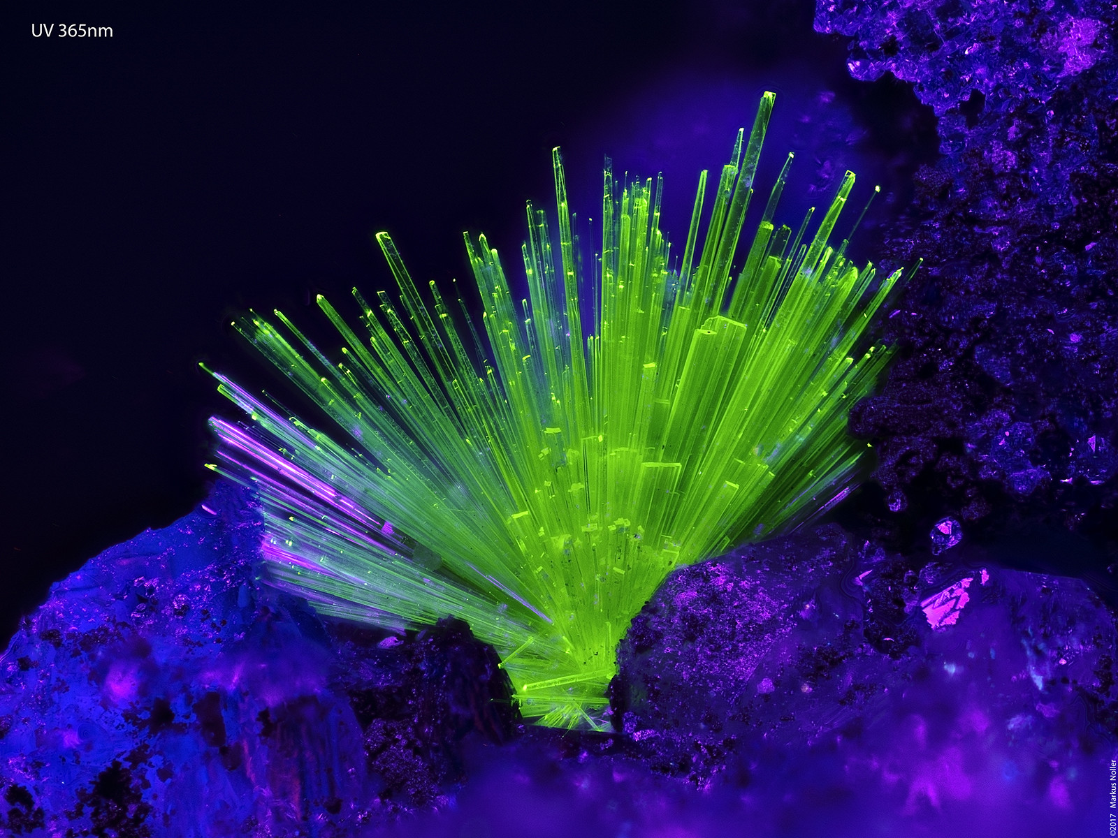 Was die Stufe im Bild des Eingangspost betrifft, so sind das tatsächlich zwei unterschiedliche Farben. Das rechts an der Stufe grün fluoreszierende ist Uranocircit, das Rote ist Baryt und das Blaue Fluorit (?). Auch ich empfinde die Fluoreszenz des Uranophan als gelb-grün.