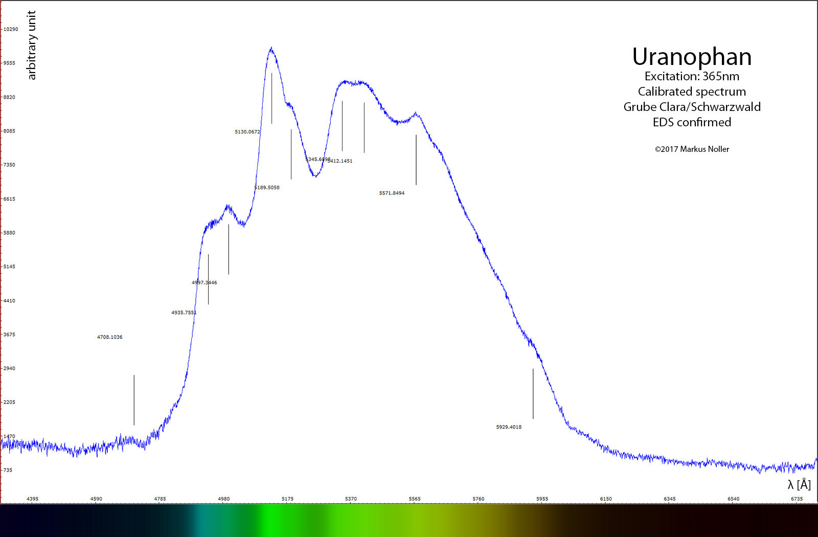 Anbei mal ein Bild von dem Fluoreszenzspektrum der Stufe und dem verkokelten Uranophan. Da muss man echt aufpassen (gilt übrigens auch für Raman bei entsprechender Anregungsleistung).