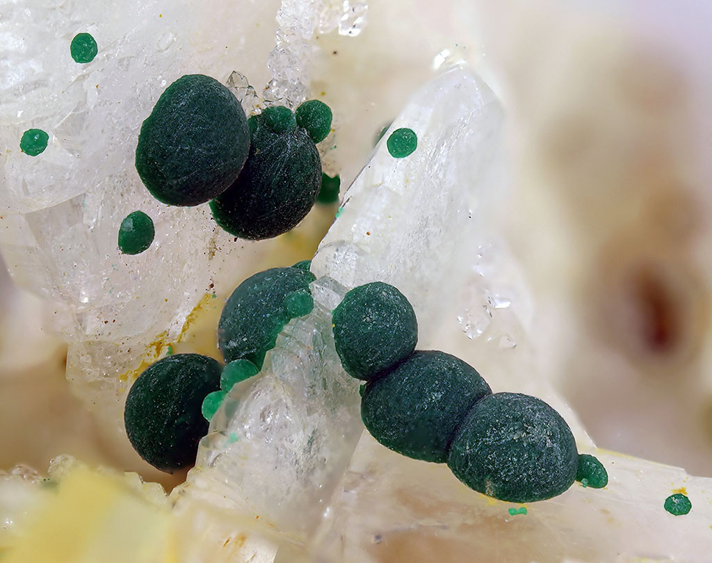 Kugelcalcite auf Chalcedon vom stillgelegten Steinbruch Dürrer Schlag bei Erbendorf Oberpfalz. Größe 2x3 und 4x5cm