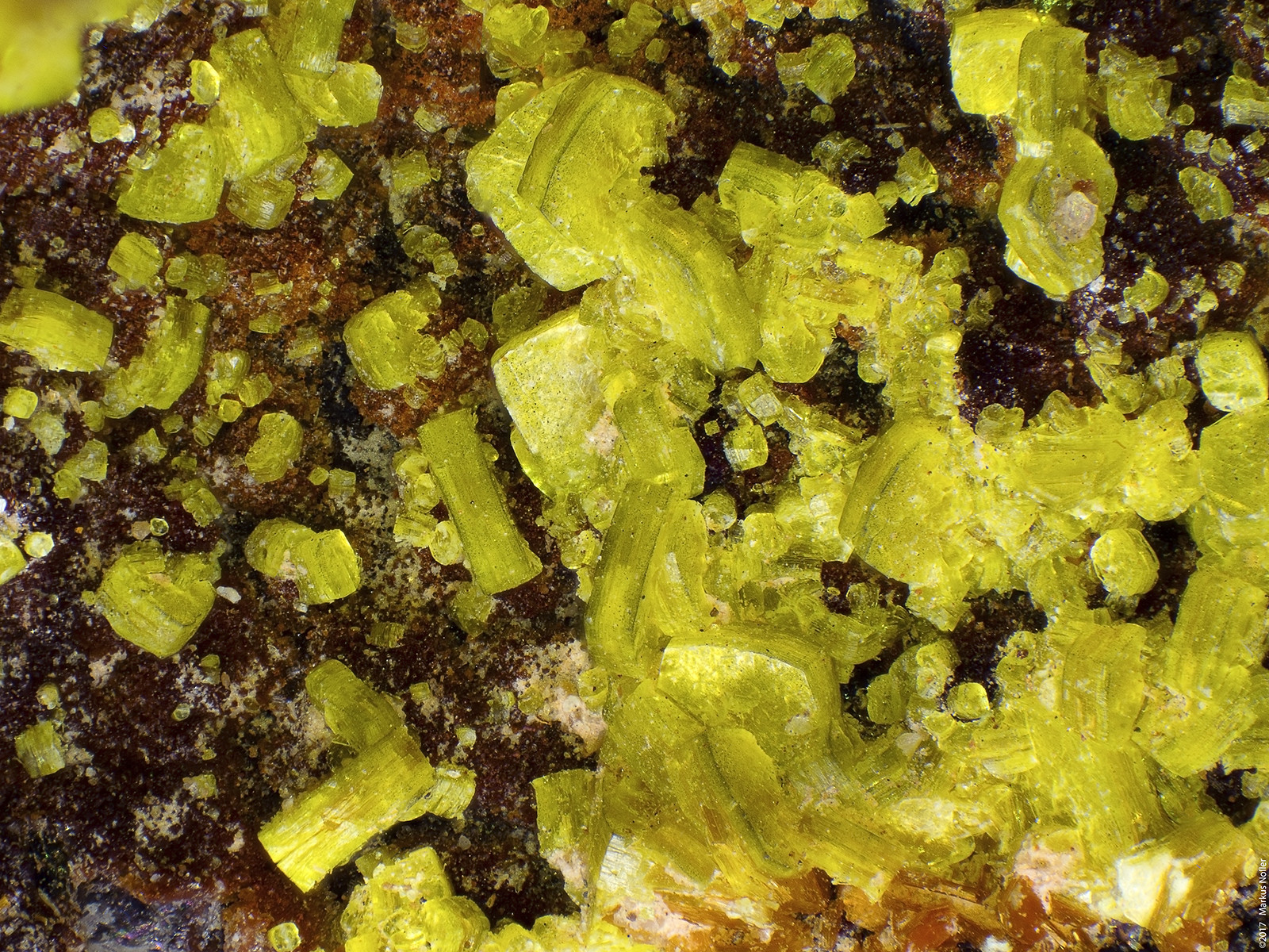Diese Stufe aus der ex Bültemannsammlung steht in der Sammlungsliste als Heinrichit xx aus Menzenschwand/Schwarzwald beschrieben. Eine Fluoreszenzspektralanalyse ergab aber, dass es sich dabei nicht um Heinrichit handelt, sondern um (Meta-) Autunit oder Metauranocircit. Von der Spektrenauswertung her trifft es im Vergleich mit Referenzwerten von Geipel et al 2000 am ehesten auf Metauranocircit zu. Im Bereich der Messtoleranz und der statistischen Unsicherheit der Referenzwerte (es wurden je nur eine Probe vermessen) liegen aber auch Autunit und Metaautunit. Nun meine ich hier die Metaversion eines der beiden möglichen Minerale vorliegen zu haben. Die gerundeten Kristallformen kenne ich eigentlich nur von Autunit, nicht aber von Uranocircit, was mich dazu tendieren ließ, die Stufe als Metaautunit anzusprechen. Da eine kurzfristige EDX-Analyse im Moment nicht möglich ist, wollte ich mal Euch fragen, wie Ihr das einordnen würdet, um gegebenenfalls die Angaben im MA zu korrigieren...