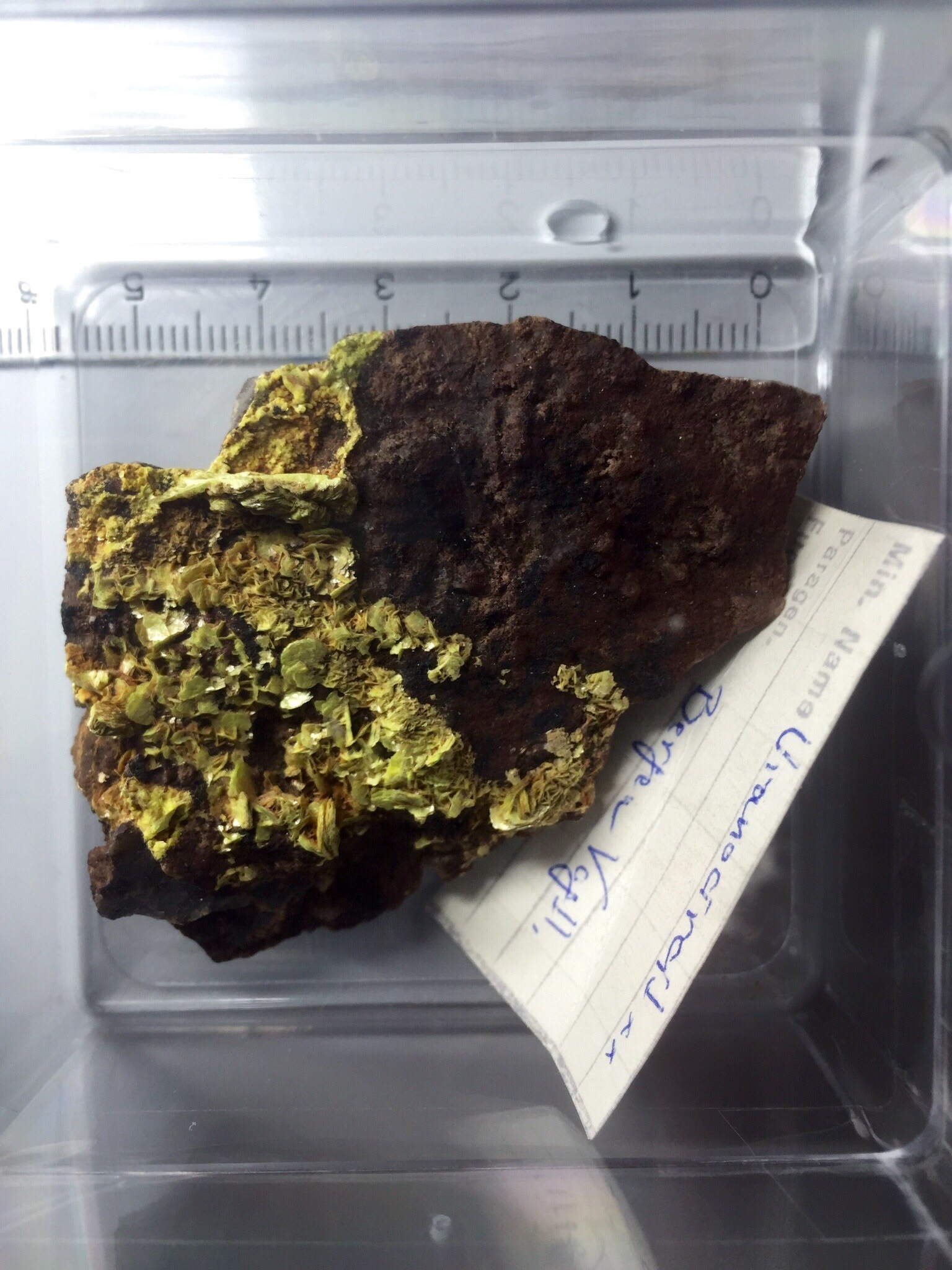 Die unten gezeigte Uranocircit Stufe befindet sich in einem Plexiglaskästchen mit einer Wanddicke von ca. 1mm. Der Abstand zwischen den Kristallen und der Sonde beim Messen betrug ca. 3cm (inkl. 1mm Plexiglas). So konnte ich immerhin ca.  7 mrad/h messen (die Hintergrundstrahlung wurde bereits abgezogen).