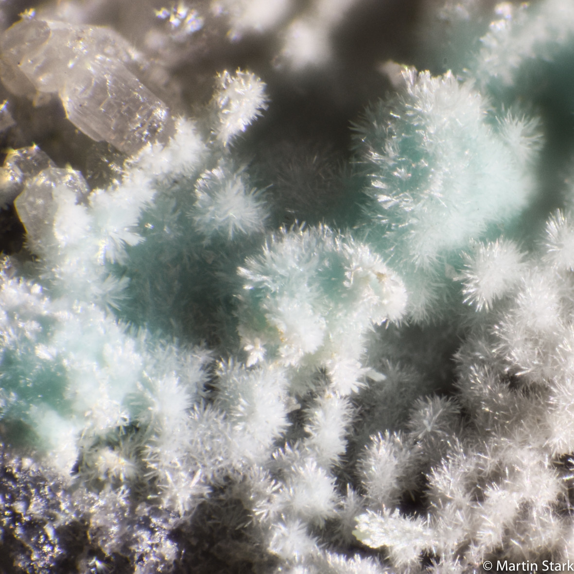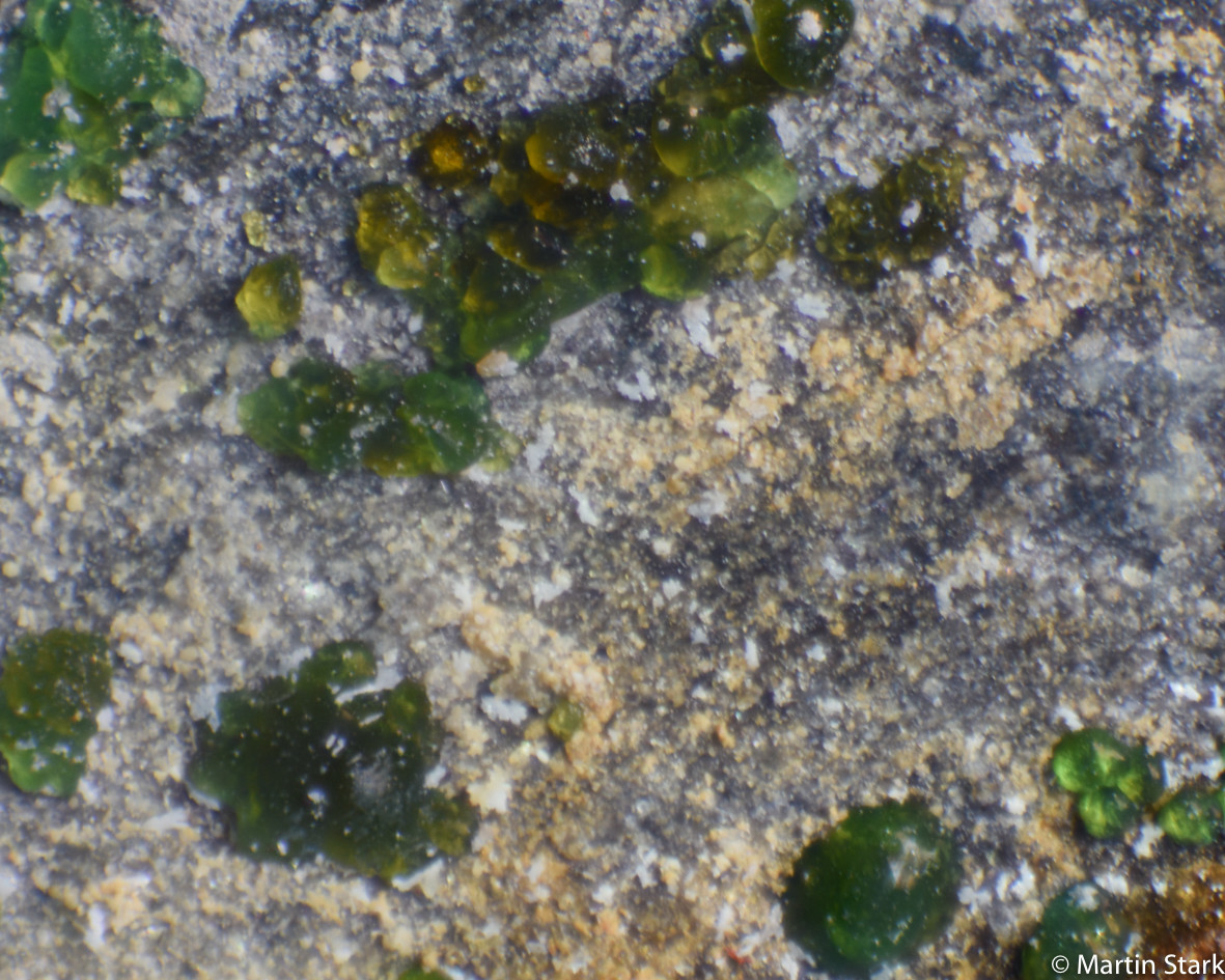 Bei den grünen glasigen Kugeln bin ich etwas unsicher. Einerseits gabs in dem Material quasi den gesamten Übergang: weiße feinkristalline Rasen-> nadelige Aggregate-> kugelige Aggregate -> kompakte kugelige Aggregate (grün; an Bruchflächen sieht man im Inneren mit klare Kristallen, EDX ergab keine signifikanten Unterschiede zwischen Innen und Außen)->glasige Aggregate.