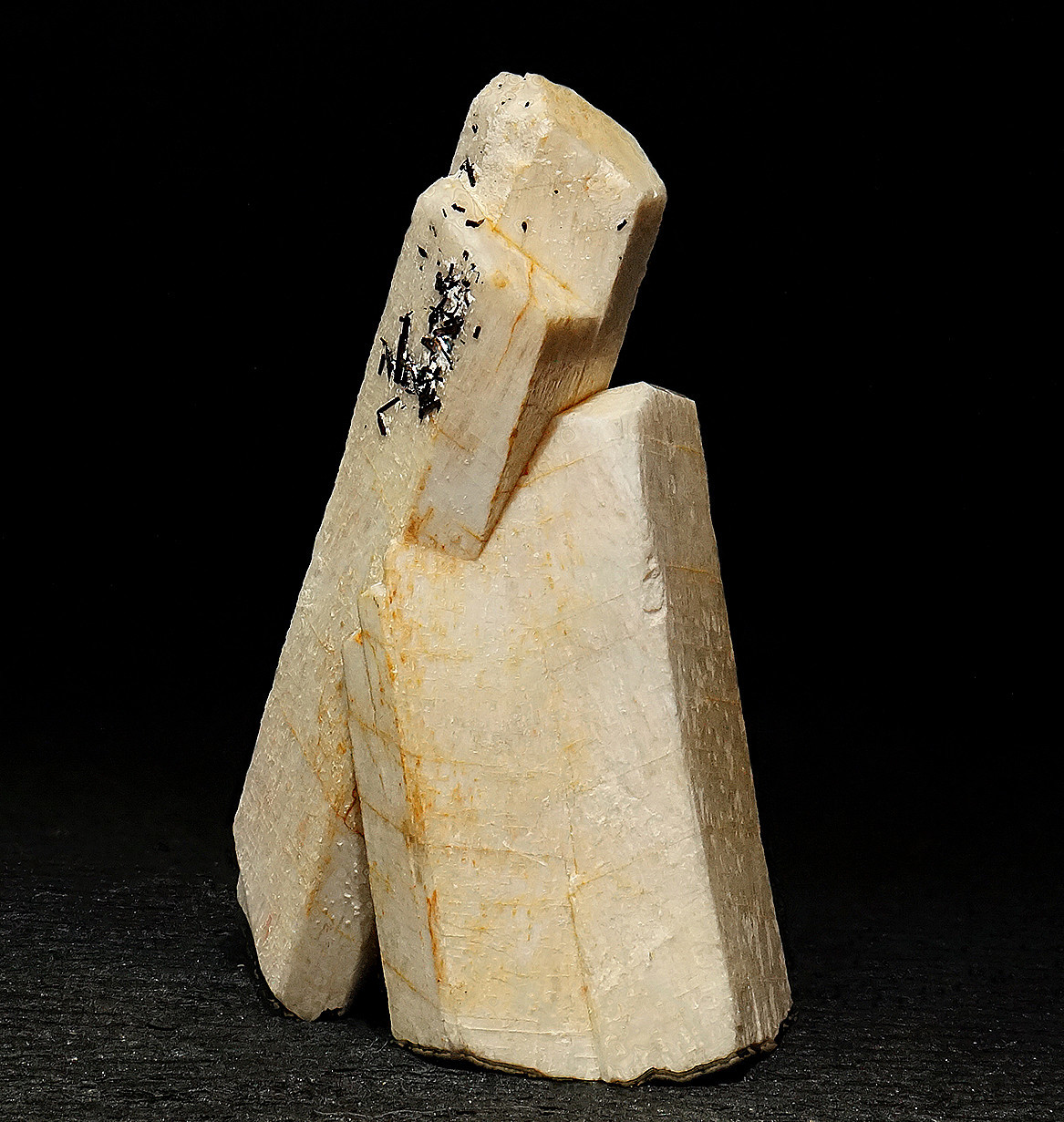 Die unteren Kristalle zeigen eine Zwillingsbildung nach dem Karlsbader Gesetz. Zwillingsebene ist in der Mitte der Fläche.