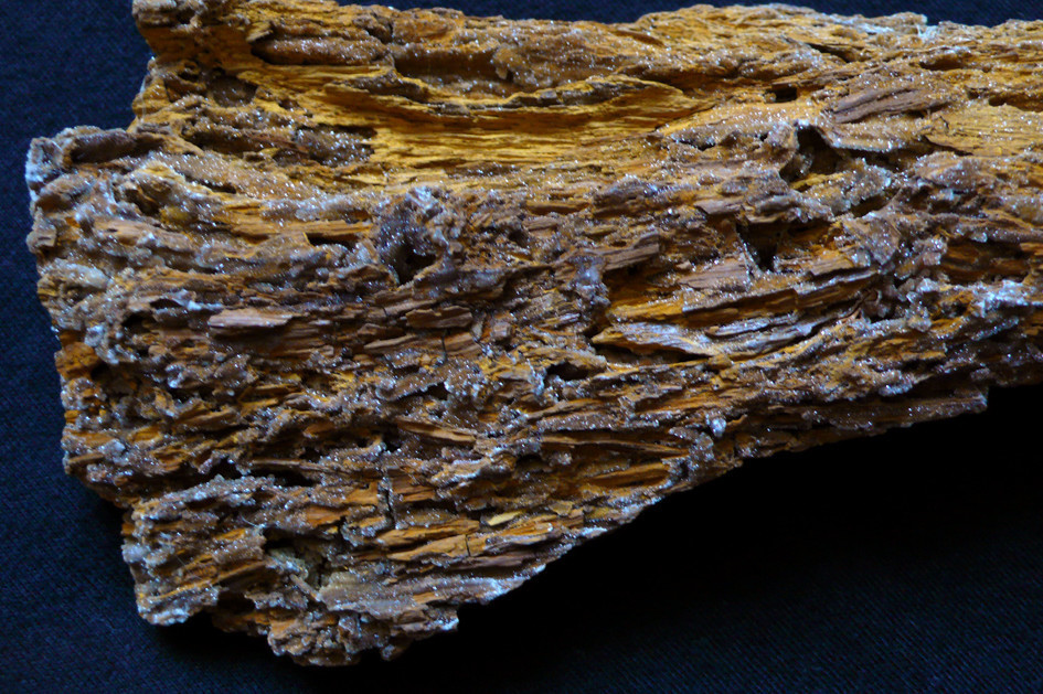 Das im Folgenden gezeigte Kieselholzstück stammt aus Oberdorf. Leider ist es nur eine 2 cm starke Scheibe (ca. 17 x 13 cm; Abb. 1), ich hab`s nicht selbst gefunden, sondern erworben (Fund von Wolfgang Ott aus 1990). Die Außenansicht (Abb. 2) zeigt in Rissen/Spalten sehr kleine Quarz-xx (am Foto wegen schlechter Ausleuchtung leider nicht erkennbar) und kohlige Reste. Die Rückseite ist nur geschnitten und nicht poliert, man sieht deswegen am Foto die Struktur sogar noch besser als auf der Vorderseite (Abb. 3-4). Das Stück ist unbestimmt, es handelt sich nach dem oben gesagten aber wohl um ein Nadelholz.