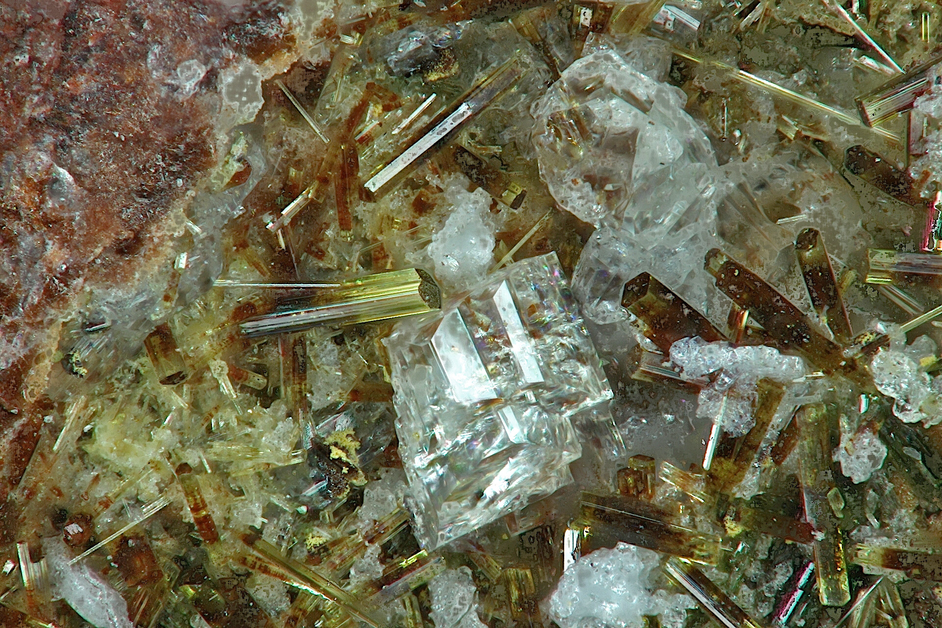 Die zweifarbigen Nadeln sind aber durchaus Amphibole, die Winkel sehen schon danach aus. Präzisieren sollte man also nur die Begleitminerale. Dabei sehe ich den Sanidin auch als gesichert an, alles andere ist nicht sicher zu erkennen und sollte daher weggelassen werden.