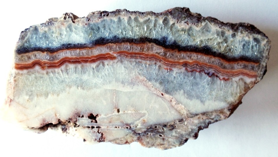 Es ist ganz typisch, dass die weiße Hornstein-Schicht (die in Kammquarz übergehen kann) zwischen den Achat-Bändern auftritt.
