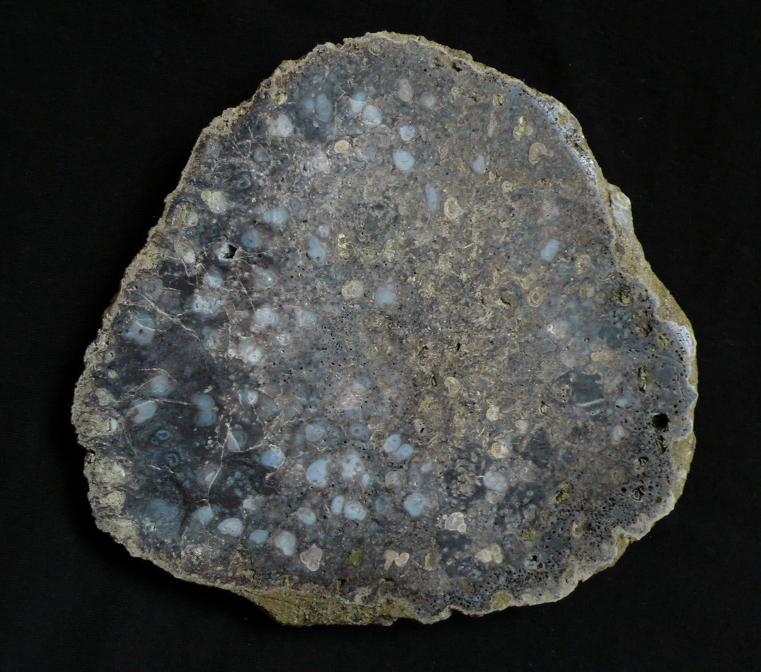 Bei diesem Fossil ist die Matrix ein schwach gelblichgrüner / hell olivgrüner bis hell (grau)brauner Quarzsandstein. Die Stelen sind in hellblauem Chalzedon fossilisiert, die "Grundmasse" und LuWus sind, wo gut verkieselt, dunkelbraun bis bläulich, in schwächer verkieselten Bereichen hell graubraun bis gelbbraun. In diesen Bereichen sind auch wenige Hohlräume von Stelen, welche schon vor der Verkieselung vergangen waren, diese sind mit grünlichem Quarz(?)material gefüllt (ähnlich der Matrix, aber dieser doch nicht ganz entsprechend).