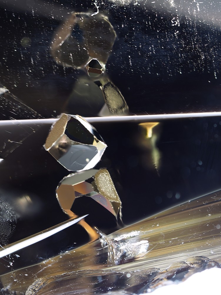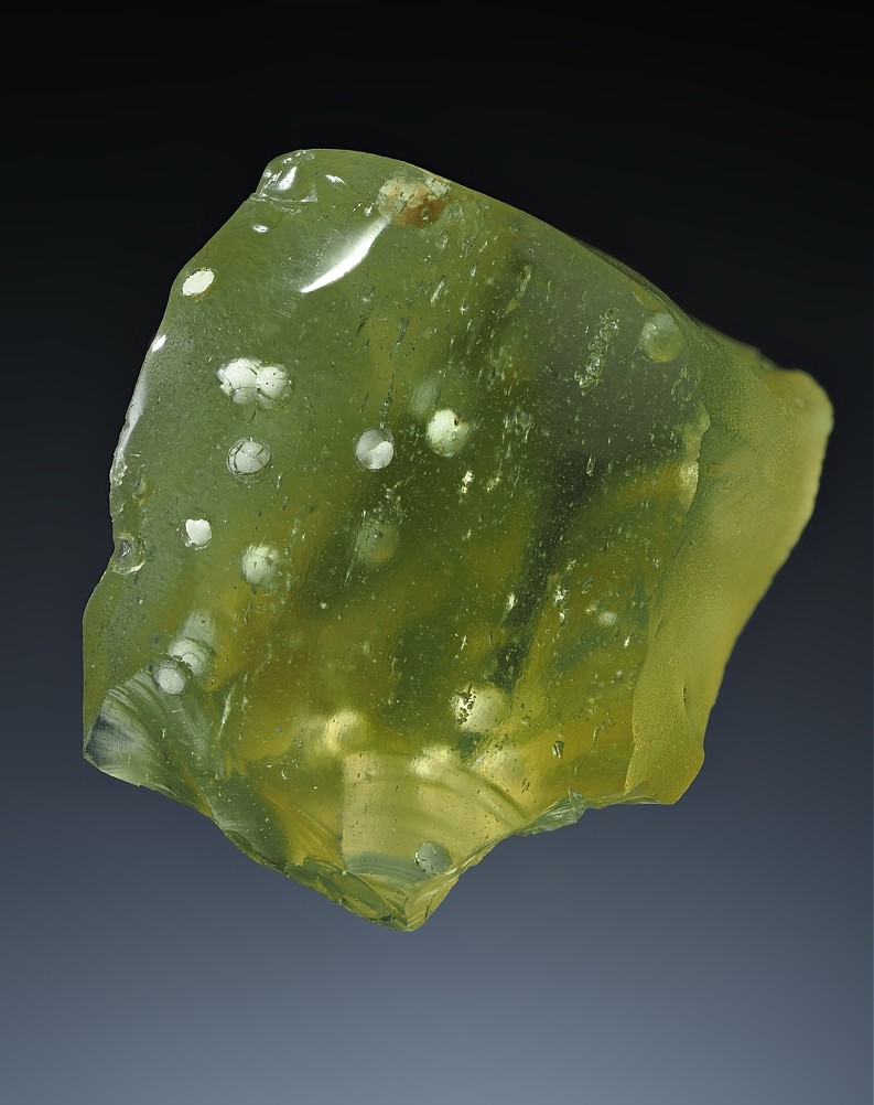Kleine putzige Christobalitkügelchen zieren dieses libysche Wüstenglas:
