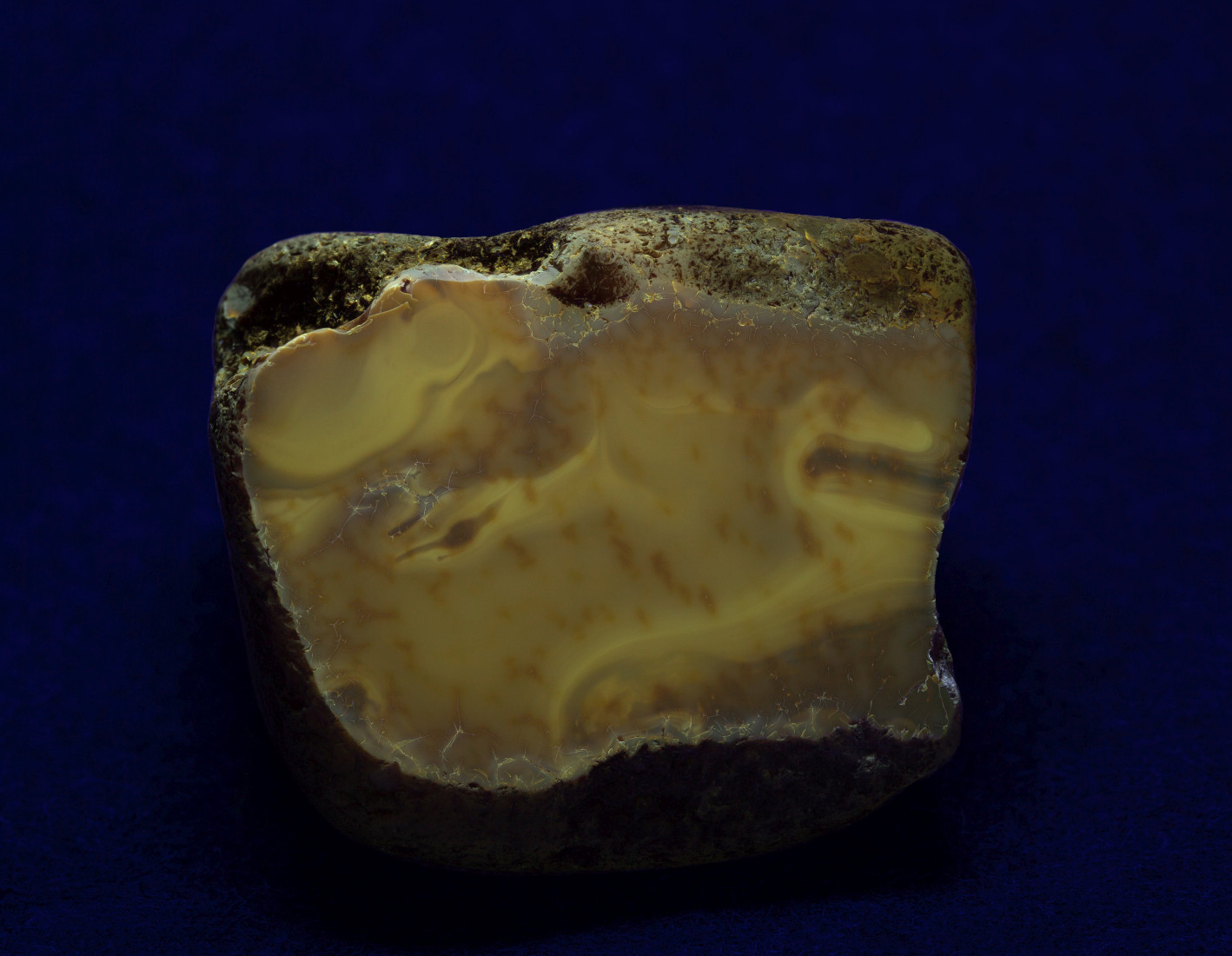 Unter LW-UV eine für Bernstein sehr ungewöhnliche Farbe: