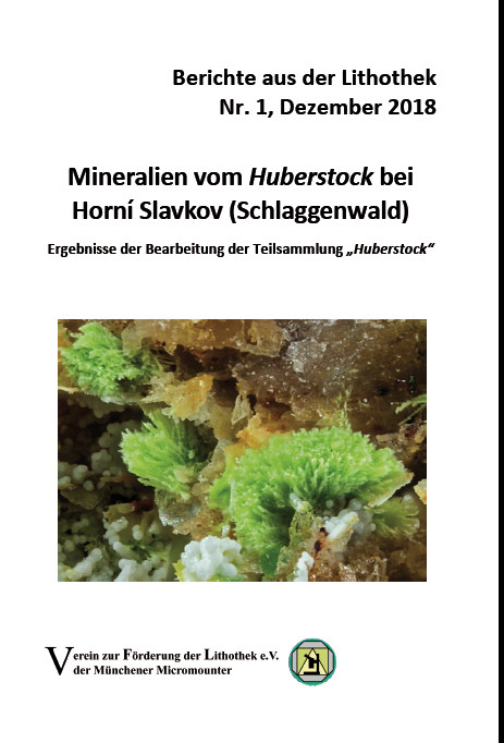 Auf 36 Seiten und mit über 100 Fotos und anderen Darstellungen wird die Teilsammlung Huberstock der Lithothek vorgestellt. Neufunde und Analysen ausgewählter, interessanter Stücke sowie ein allgemeiner Überblick geben den aktuellen Stand der Teilsammlung wieder. In gedruckter Form zu beziehen beim Herausgeber gegen einen Kostenbeitrag* von €5.40 zzgl. Versandkosten; email an: lithothek(at)gmx.de.
