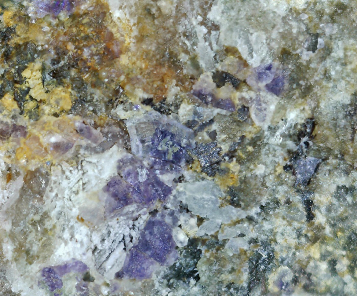 Ich halte das helle Mineral eher für Calcit als für Fluorit. Letzterer ist mir aus solchen Skarnmineralisatonen unbekannt. Wenn es blau fluoresziert, kommt noch Scheelit in Frage.