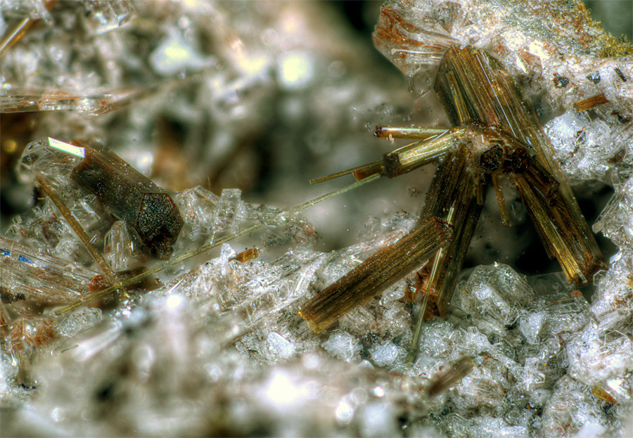 Pseudobrookit sehe ich da auch keinen. Ob das allerdings alles Amphibole sind? Die Winkel sind nicht bei allen gut zu erkennen. Es kann auch Amphibol auf Pyroxen aufgewachsen sein.