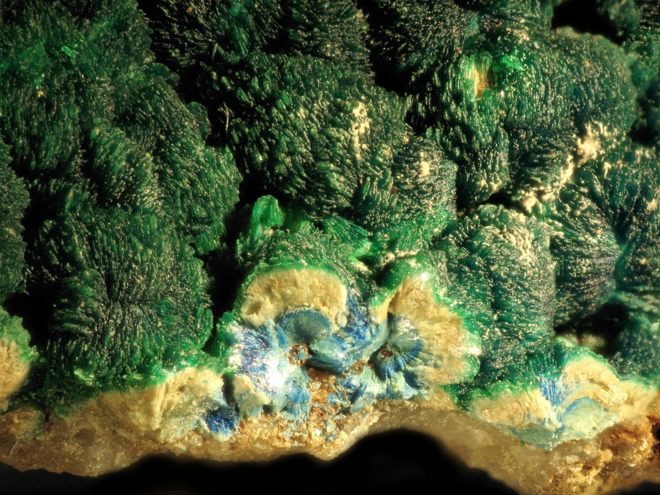 Eher als eine Abfolge Azurit darum eine braue Masse und darauf ist dann der Brochantit aufgewachsen.