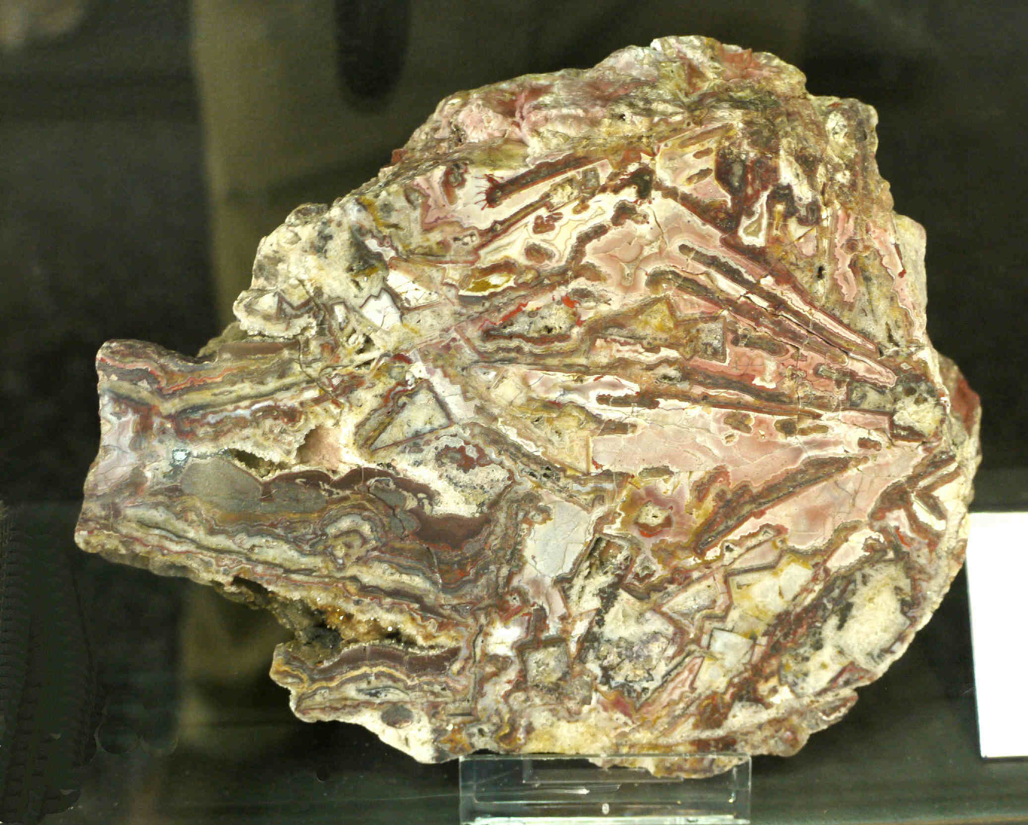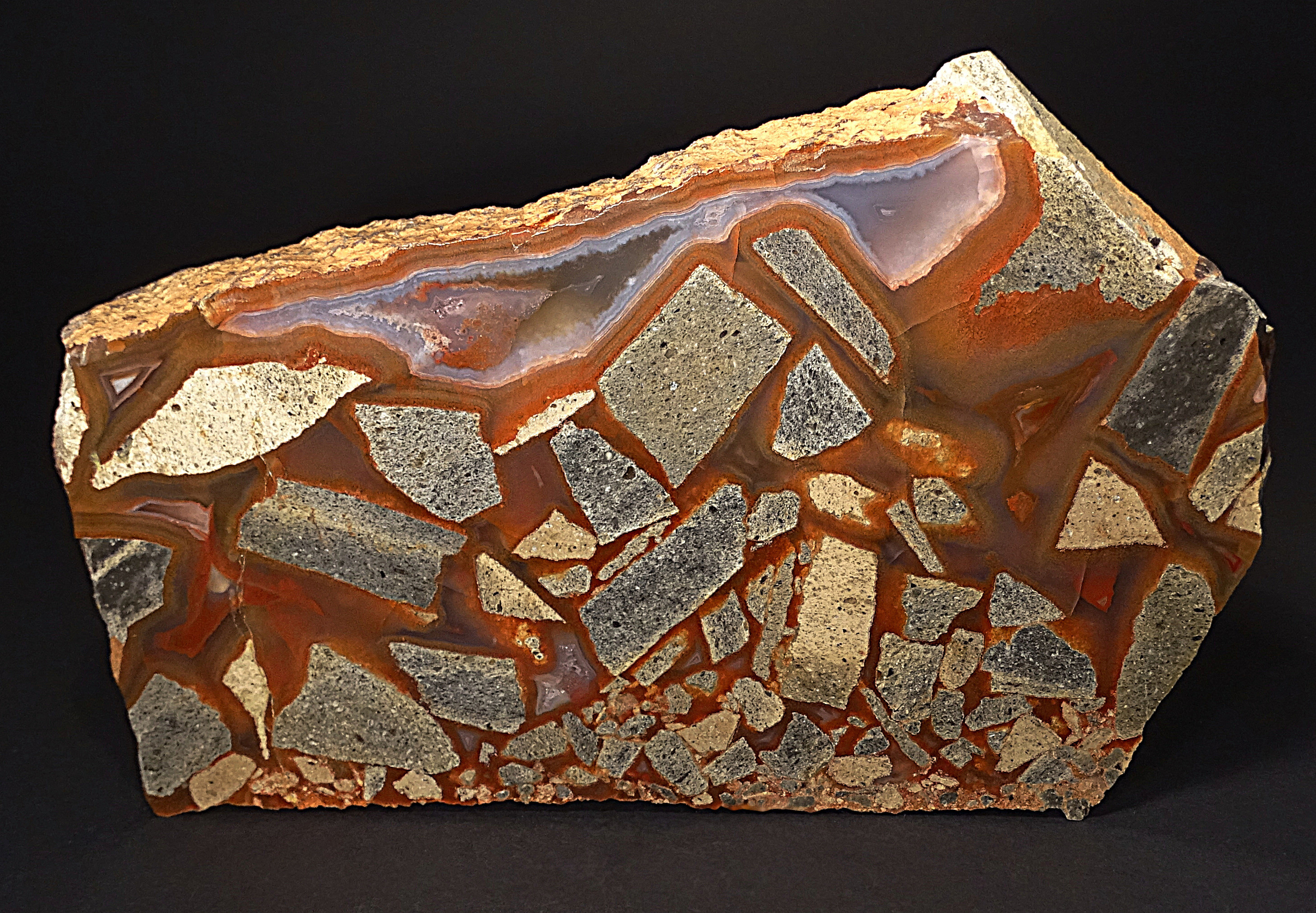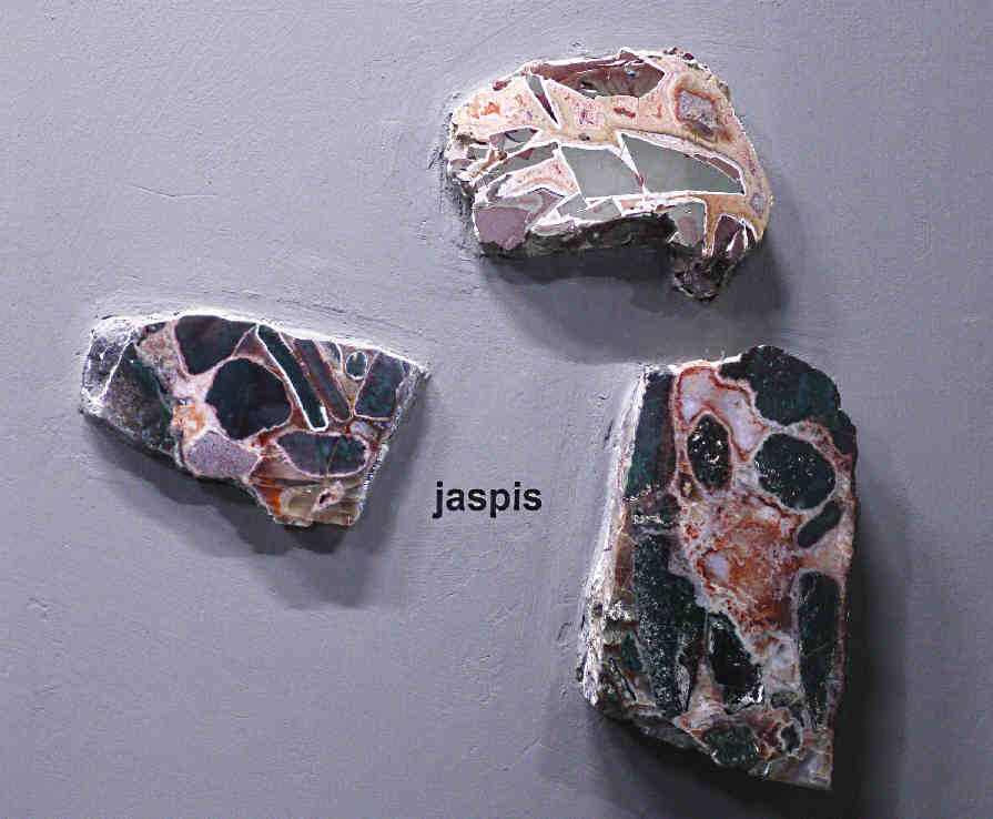Das steht Jaspis und als Bildunterschrift Trümmerachat. Ja was ist es denn nun? Hier sind es eindeutig Brekzien. Gesteinstrümmer in Quarz eingelagert. Eine Achatbänderung ist nicht ersichtlich und wenn tatsächlich vorhanden (obere Bild), so ist eine tektonische Trümmerung der Achatbänder die dem Namen recht geben nicht erkennbar. Es bleibt eine Brekzie.
