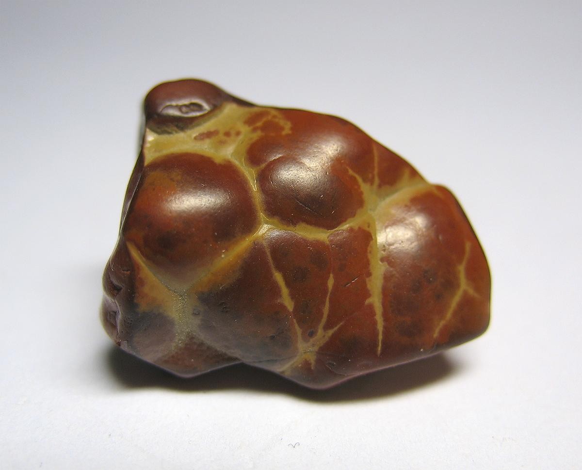 Auf den Bildern kann man erkennen, dass er augenscheinlich durch die Brandung rundgewaschen wurde, er ist aus sehr feiner Substanz und es hat den Anschein, dass er aus mehren Schichten besteht, die Äußere ist schon an vielen Stellen "durchgescheuert". Das erste Bild entspricht am meistem dem natürlichen Farbton, ein dunkles Olivgrün.