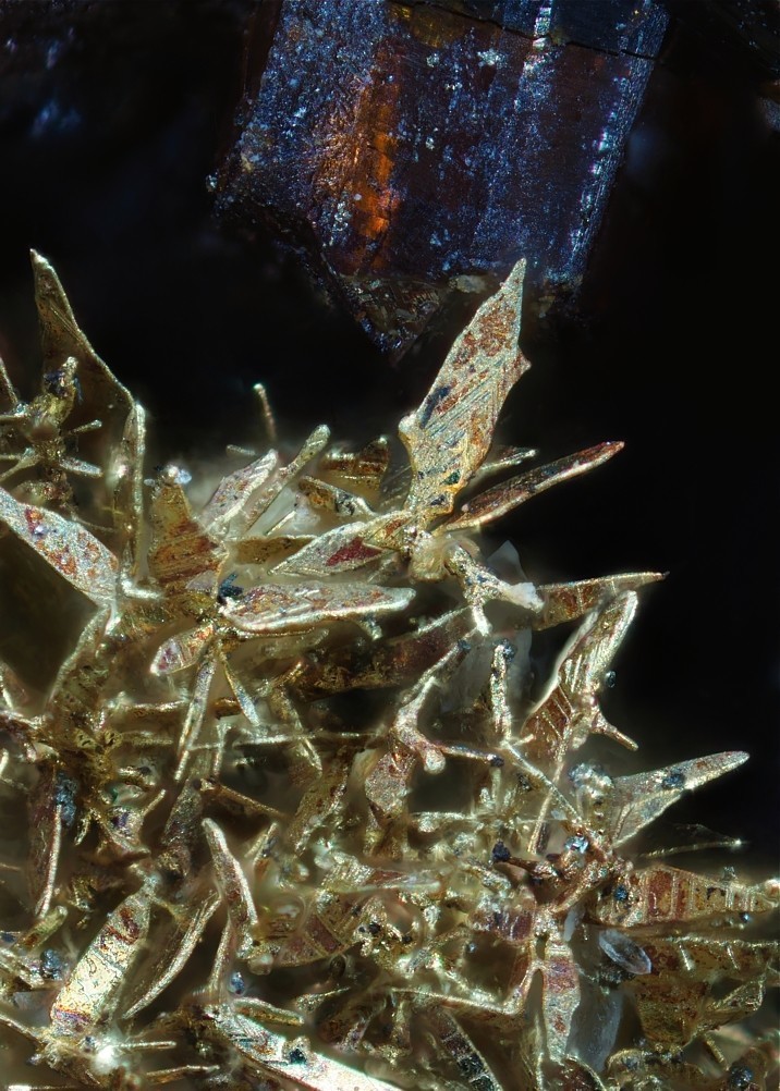 Flache, büschelig verwachsene Goldkristalle zusammen mit Sphalerit von Verespatak (Rosia Montana) in Rumänien.
