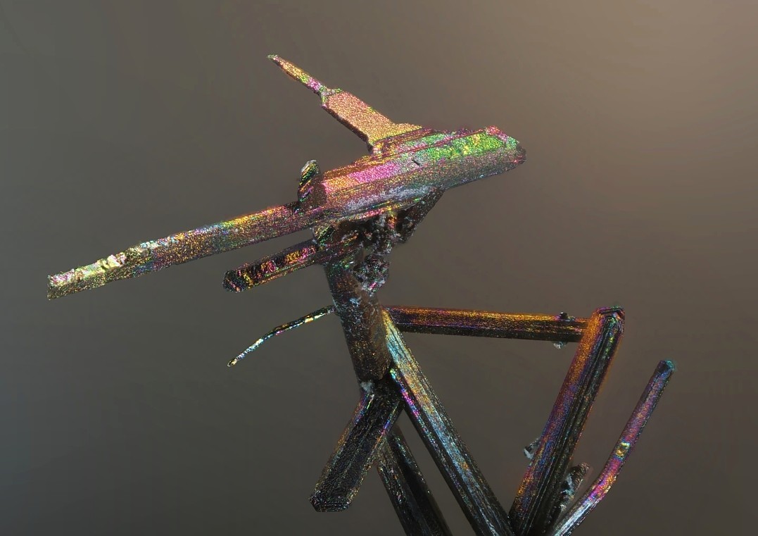 Arsen in seiner rhombischen Modifikdtion als prismatische, teilweise verzwillingte Arsenolampritkristalle von Mackenheim im Odenwald.