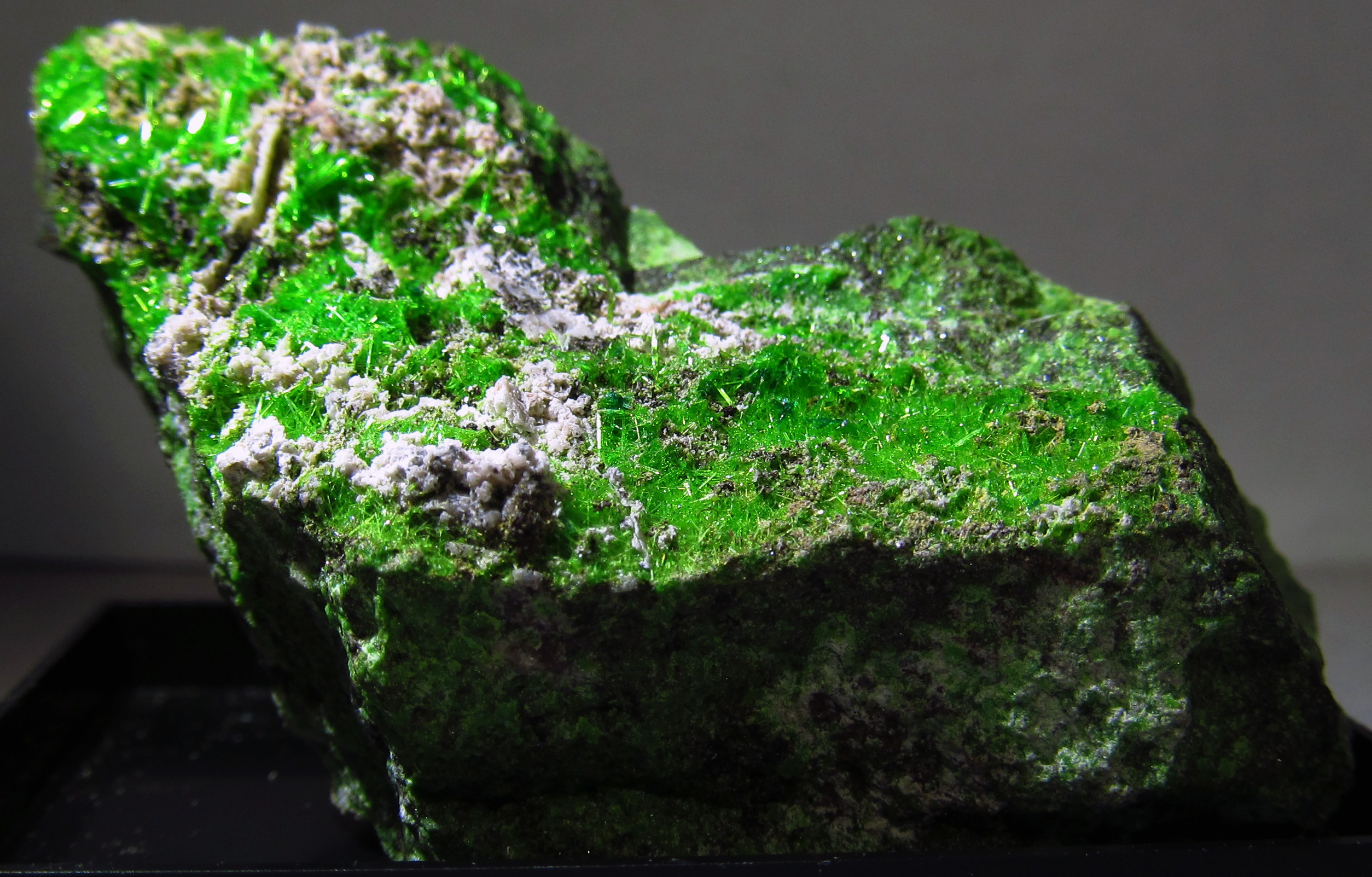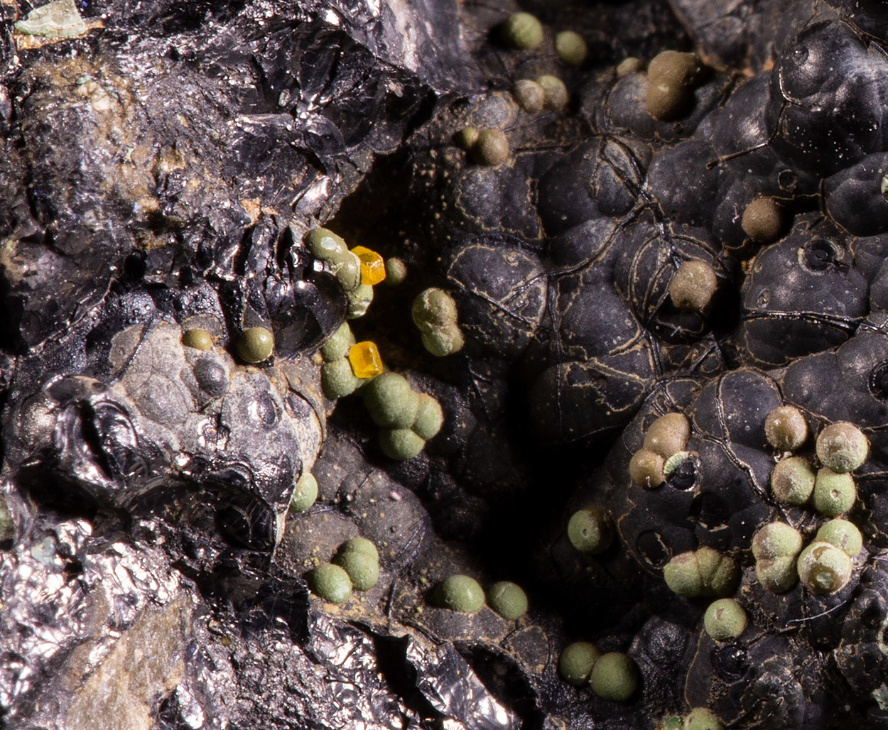 Da könnte man bei den schwarzen Nadeln auf entwässerten Ianthinit oder ähnliche Späße kommen, es ist aber nur eine Heterogenitkruste auf Curit. H. ist da gar nicht so untypisch.
