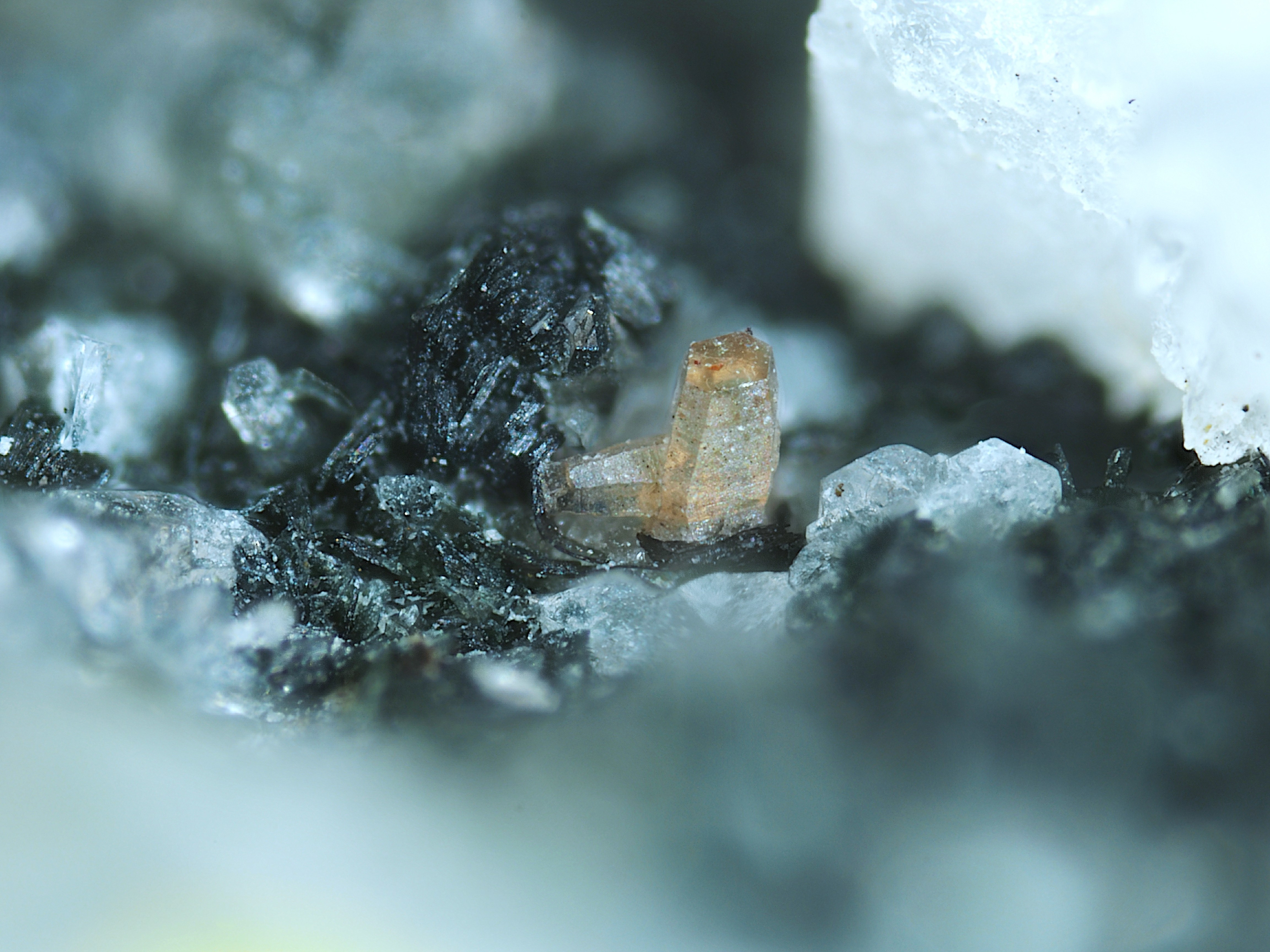 Neben diesen Kristallen sind mir an einer anderen Stelle noch hexagonale farblose bis milchige Kristalle aufgefallen. Das könnten auch eventuell Apatite sein. Aber die Kristalle auf dem Foto sehen eigentlich nicht danach aus.