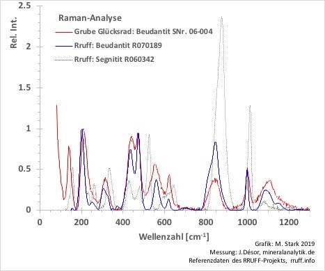 Meine Anmerkung bezieht sich auf die Unterscheidung Beudantit/Segnitit: Das als Referenz für Segnitit angeführte Spektrum R060342 ist laut Rruff-DB "not yet confirmed", kann also irgendwas sein, vermutlich aber kein Segnitit, wenn man es mit dem Beudantit vergleicht. R060342 zeigt ebenfalls eine deutliche Bande im Bereich, der normalerweise Sulfat-Gruppen zeigt. Ansonsten unterscheidet es sich bei den kleinen Banden deutlich von Beudantit. Bei zwei Mineralen, die sich nur durch den Sulfatgehalt voneinander unterscheiden, würde man das eigentlich nicht so deutlich erwarten. Daher meine Skepsis bei dieser Referenz.