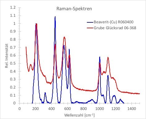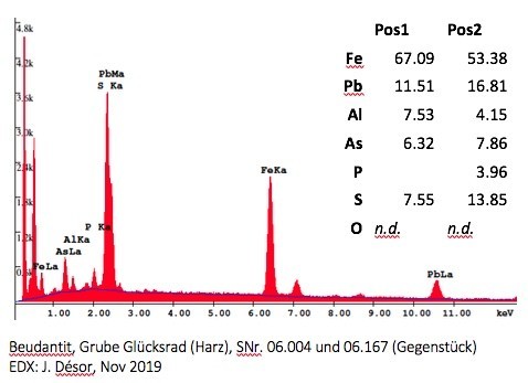 Da die EDS-Daten ("Pos1", "Pos2") des Beudantits eindeutig sind, war eine Raman-Analyse eigentlich gar nicht nötig. Ich vermute, Joy hat die Raman-Spektren hauptsächlich für seine Raman-Datenbank aufgenommen.