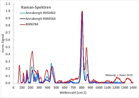 Bei der Annabergit-Messung fehlt auf jeden Fall eine Bestätigung durch EDX. Nach meiner Erfahrung sind die eng verwandten Arsenate Annabergit, Babanekit, Erythrin, etc. mit Raman allein nicht zu unterscheiden. Die Banden der Referenzen weichen nur sehr gering voneinander ab und es liegen meist mehr oder weniger wilde Mischkristalle vor.