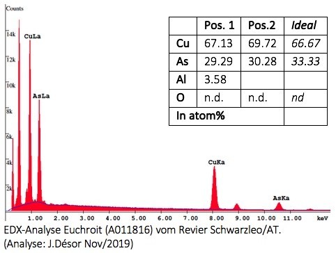 Zusammen mit dem Erscheinungsbild reichen hier m.E. die EDX-Daten aus, um Euchroit zu identifizieren, zumal die Quantifizierung recht gut passt.