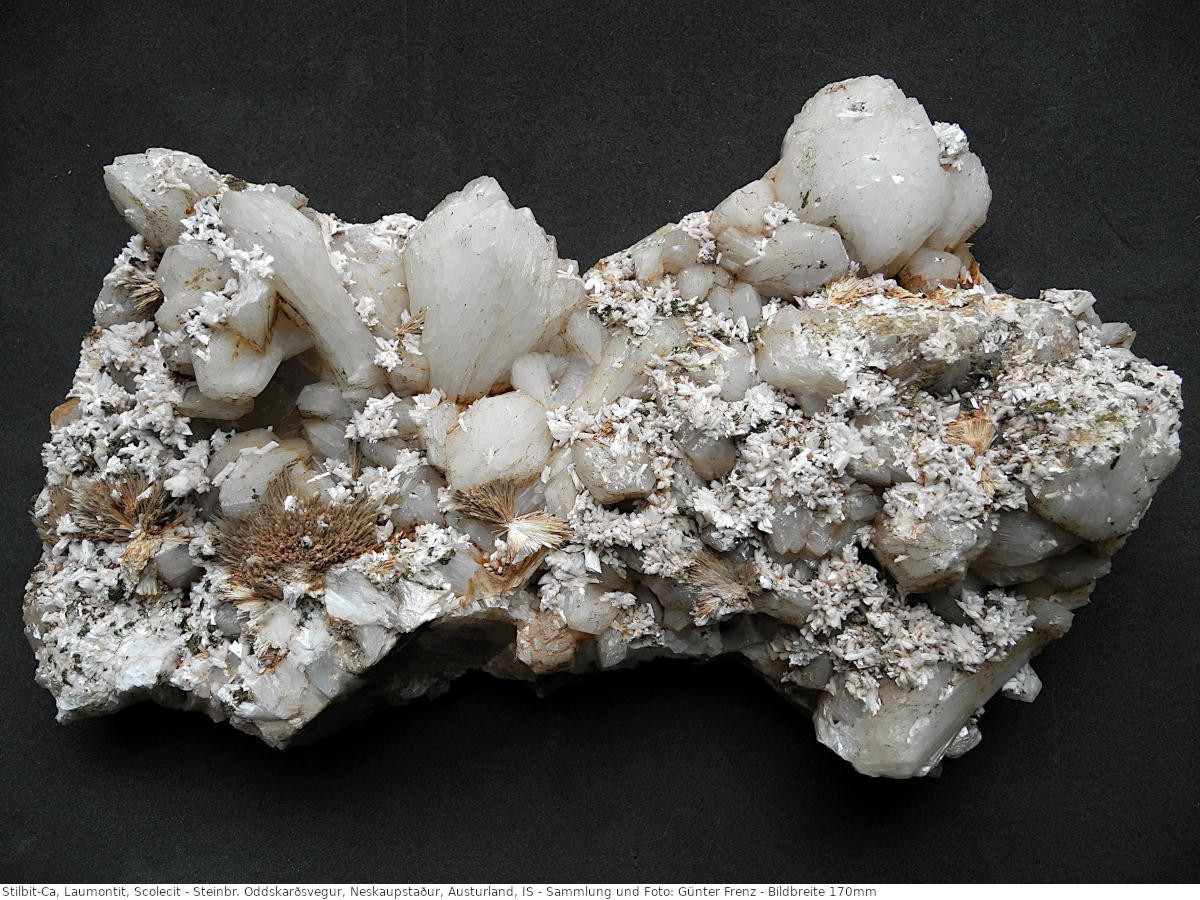 Ein Foto habe ich nur von der Stufe, auf der der Scolecit sitzt. Ich habe da einen sauberen Krümel aus einem aufgebrochenen Aggregat analysiert. Den Scolecit habe ich bei dem Foto aber nicht zugeordnet, da er im Vergleich zu den anderen Mineralen auf dem Foto zu untergeordnet erscheint.
