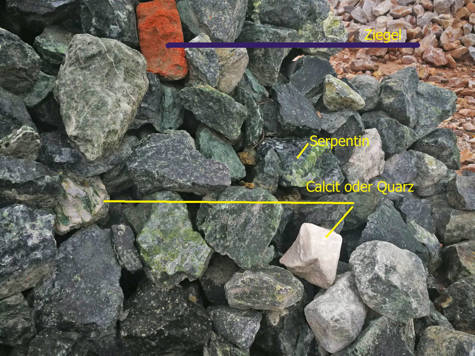 Lassen sich die Steine ritzen dann sind es Kalksteine, Calzit, wenn nicht dann sind es wahrscheinliche Quarze. Es ist bestimmt Serpentin, grüne Steine dabei. Das ist das was ich bestimmen kann.