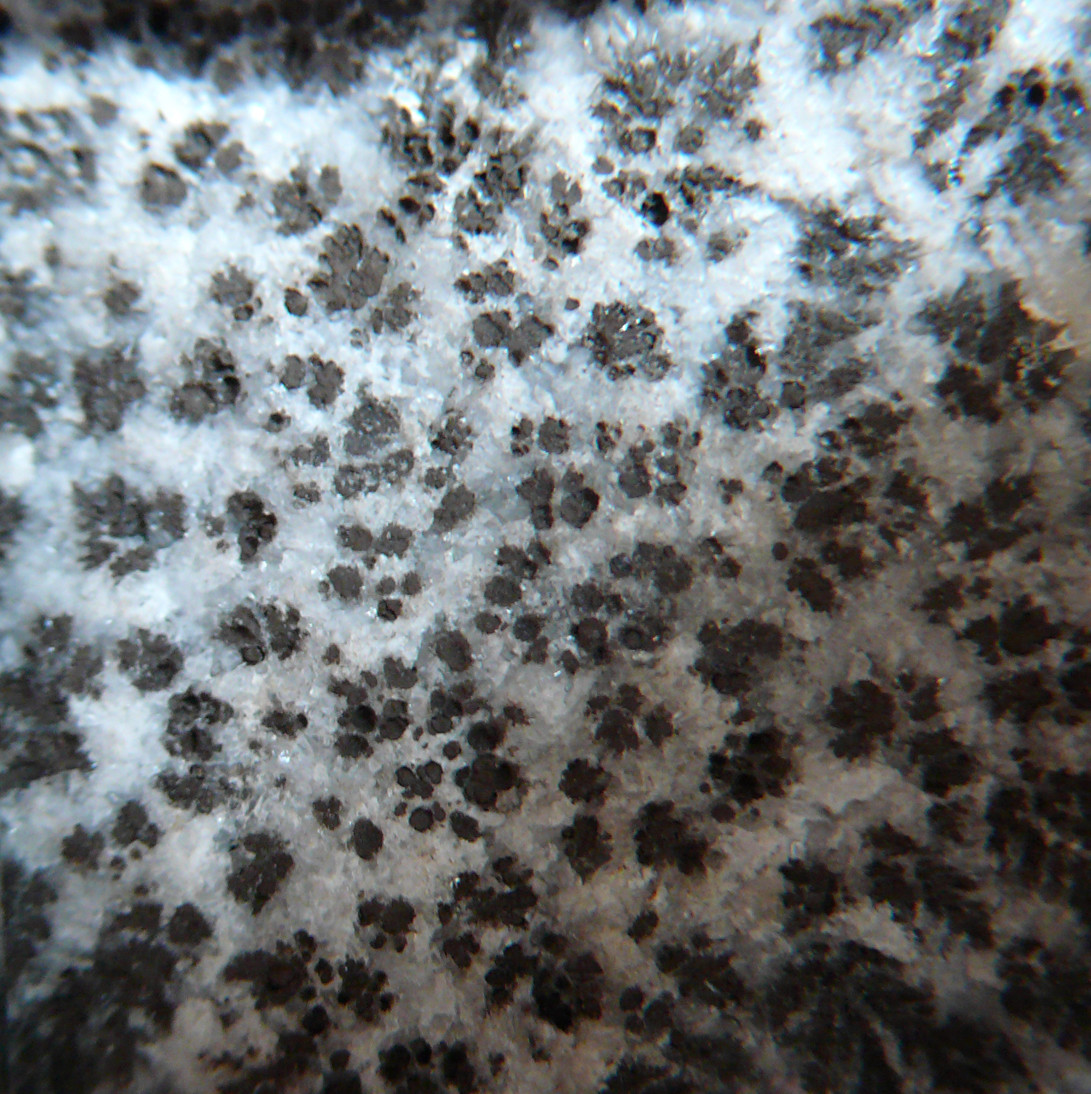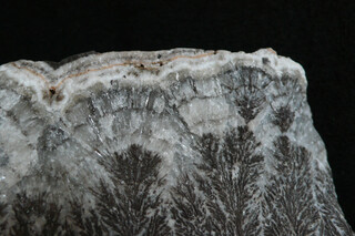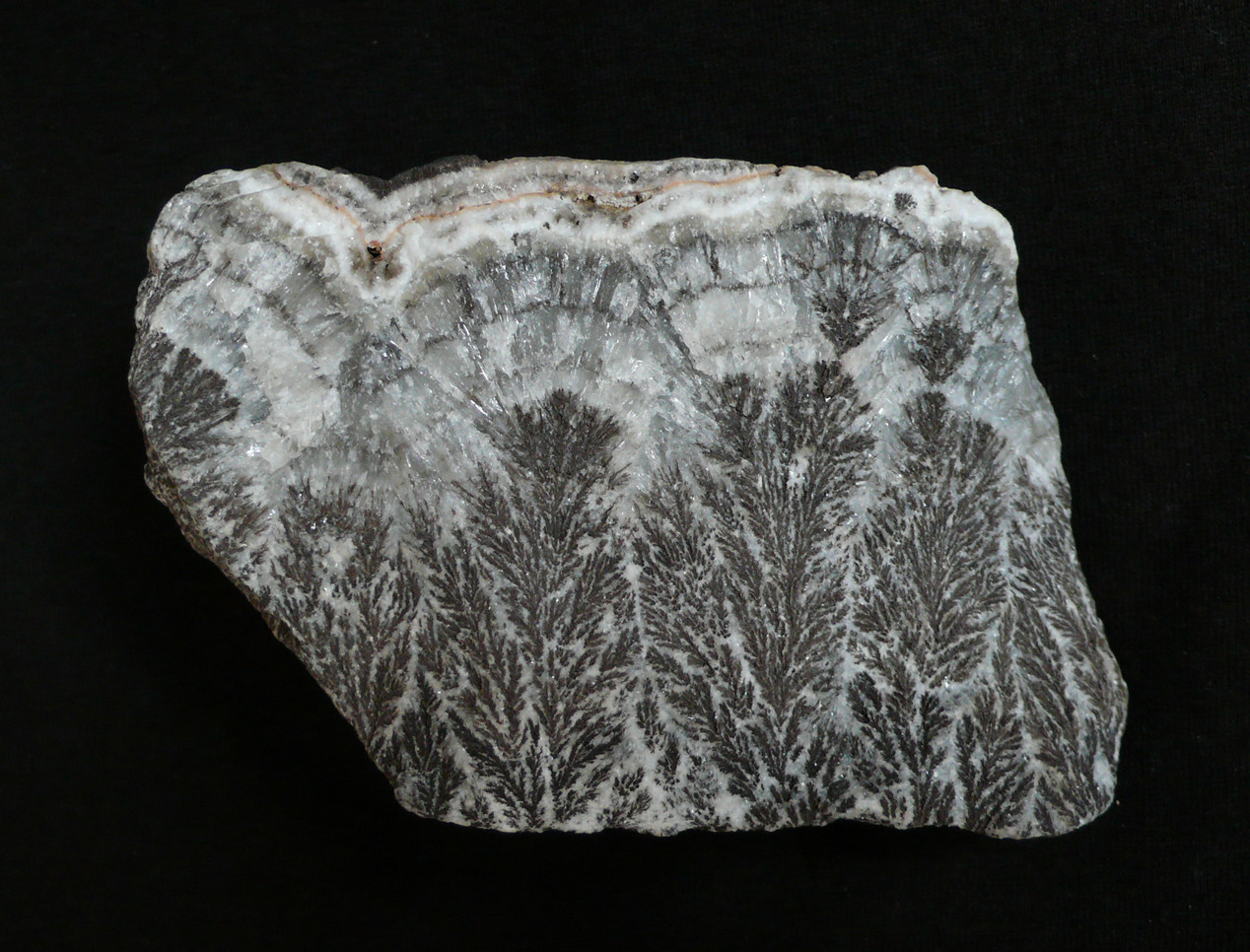Es handelt sich um ein dendritisches Erz (was auch immer) in einem Karbonat(?), wobei die Dendriten nicht flach auf einer Spaltfläche liegen, sondern dreidimensional und wirklich „bäumchenartig“ im umgebenden Mineral eingewachsen sind – gut zu sehen an der Unterseite der Stufe. Das vermutliche Karbonat (lässt sich mit der Schere problemlos ritzen) ist „radialstrahlig“ ausgebildet, mit der selben Wachstumsrichtung wie die „Bäumchen“. An der Oberseite befindet sich eine sinterartige Abschlussschicht (ganz außen beige, darunter v.a. weiß), darauf sitzt partiell eine dunkelbraune/schwarzbraune Kruste (Fe- od. Mn-Oxid?), welche – wiederum nur partiell vorhanden – eine glänzende, glatte aber wellige, makroskopisch „schwarze“, unter der Lupe aber deutlichen Metallglanz aufweisende Oberfläche hat.