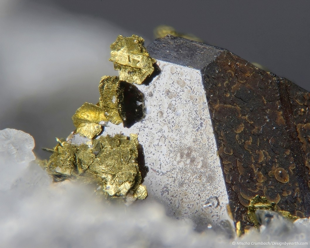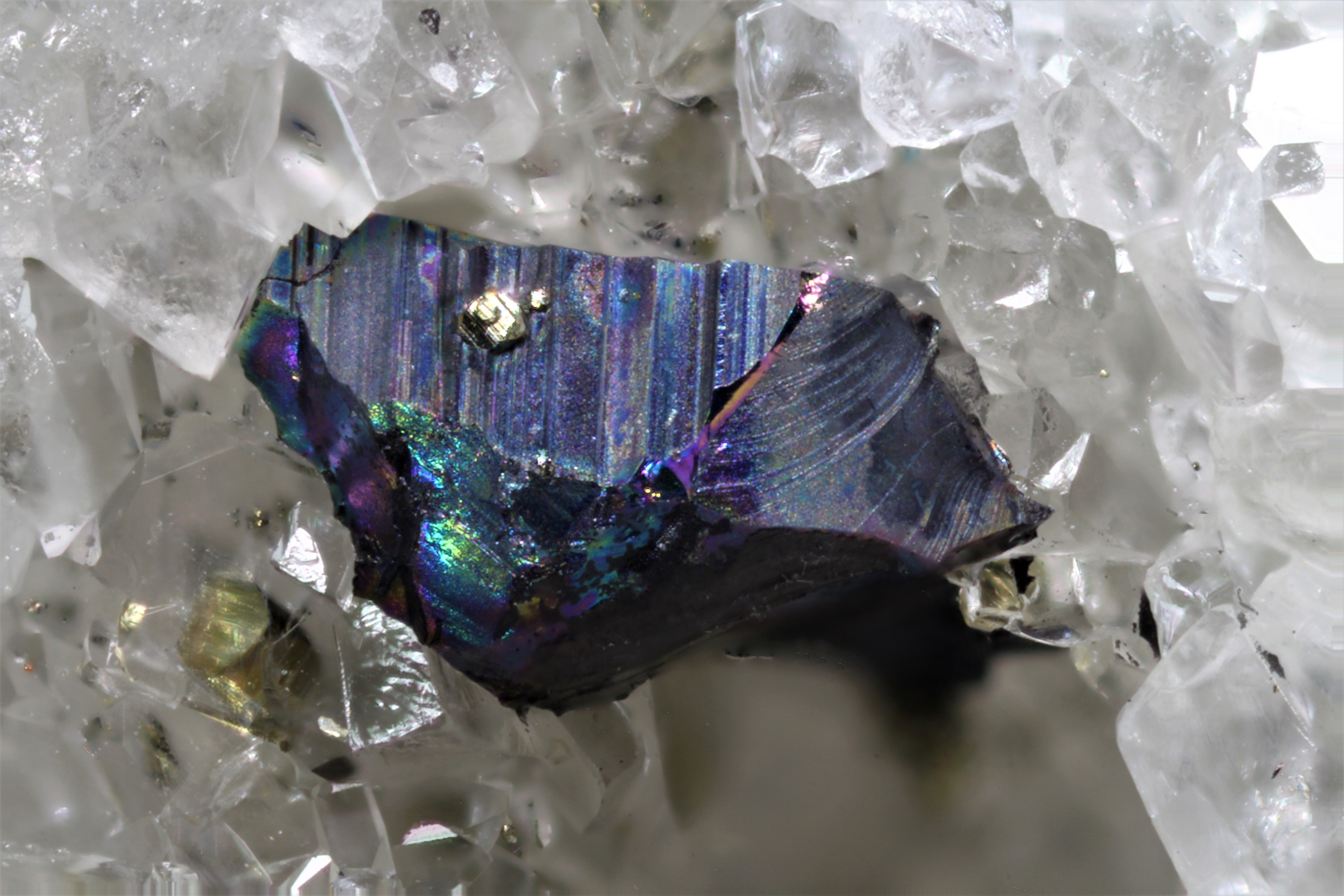 Chalkopyrit ist am Lengenbach extrem selten und bislang meines Wissens nach nur klitzeklein und eingewachsen (xenomorph) nachgewiesen. Die Mineralbruchstücke auf diesem Foto würde ich als farblich angelaufenes Sulfosalz identifizieren (Streifung). Anlauffarben kommen bei vielen verschiedenen Mineralen vom Lengenbach vor.