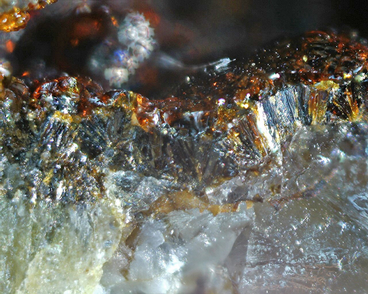 Auf einer Schicht strahligem Rockbridgeit sind diese bernsteinfarbigen kugeligen Kristalle aufgewachsen.
